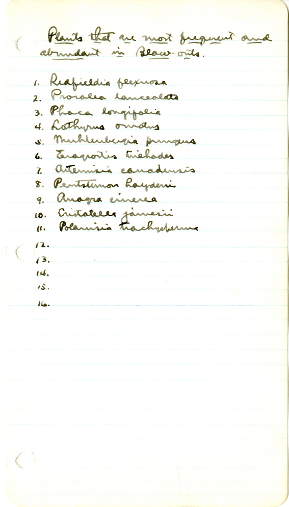 107 " Plants that are most frequent and abundant in Blow-outs. 1. Redfieldia flexuosa 2. Psoralea lanceolata 3. Phaca longifolia 4. Lathyrus omatus 5. Muhlenbergia pungens 6. Erogrostis trichodes 7. Artemsia canadensis 8. Penstemon hayderii 9. Anogra cinerea 10. Cristatella jamesii 11. Polarusia trachysperma 12. 13. 14. 15. 16.