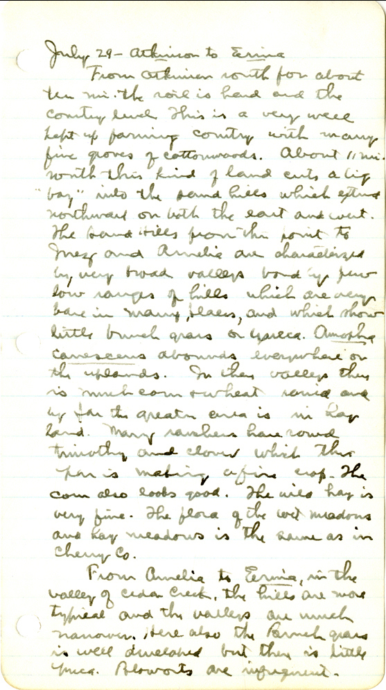 109 " July 29 - Atkinson to Erina From Atkinson south for about ten mi. the soil is hard and the country level. This is a very well kept up farming country with many fine groves of cottonwoods. About 11 mi. south this kind of land cuts a big "bay" into the Sand Hills which extend northward on both the east and west. The Sand Hills from this point to Inez and Amelia are characterized by very broad valleys bound by few low ranges of hills which show little bunch grass or Yucca. Amorpha Canescens abounds everywhere or the uplands. In these valleys there is much corn & wheat sowed and by the greater area is in hay land. Many ranchers have sowed Timothy and Clover which their span is making a fine crop. The corn also looks good. The wild hay is very fine. The flora of the wet meadows and hay meadows is the same as in Cherry Co. From Amelia to Erina , in the valley of Cedar Creek. The hills are more typcial and the valleys are much narrower> Here also the Bunch grass is well developed but there is little Yucca. Blowouts are infrequent.