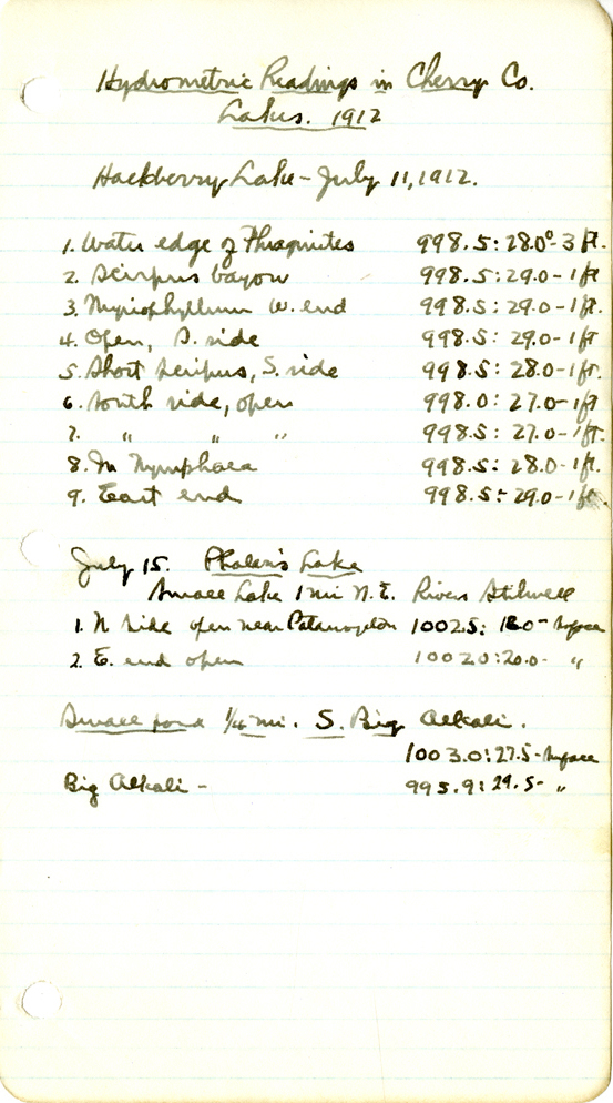 115 " Hydromatic Readings in Cherry Co. Lakes. 1912 Hackberry Lake - July 11, 1912 1. Water edge of Phragmites 998.5:28.0° - 3 ft. 2. Scirpus bayou 998.5:29.0 - 1 ft. 3. Myriophyllum W. end 998.5:29.0 - 1 ft. 4. Open, S. side 998.5:29.0 - 1 ft. 5. Short Scirpus, S. side 998.5:28.0 - 1 ft. 6. South side, open 998.0:27.0 - 1 ft. 7. " " " 998.5:27.0 - 1 ft. 8. N. Nympahaea 998.5:28.0 - 1 ft. 9. East End 998.5:29.0 - 1 ft. July 15 Phalaris Lake Small Lake 1 mi. N.E. Rivers Stilwell 1. N. side open near Potamageton 10021.5:18.0 - surface 2. E. end open 1002.0:20.0 - " Small Pond 1/4 mi. S. Big Alkali. 1003.0:27.5 - surface Big Alkali - 995.9:29.5-"