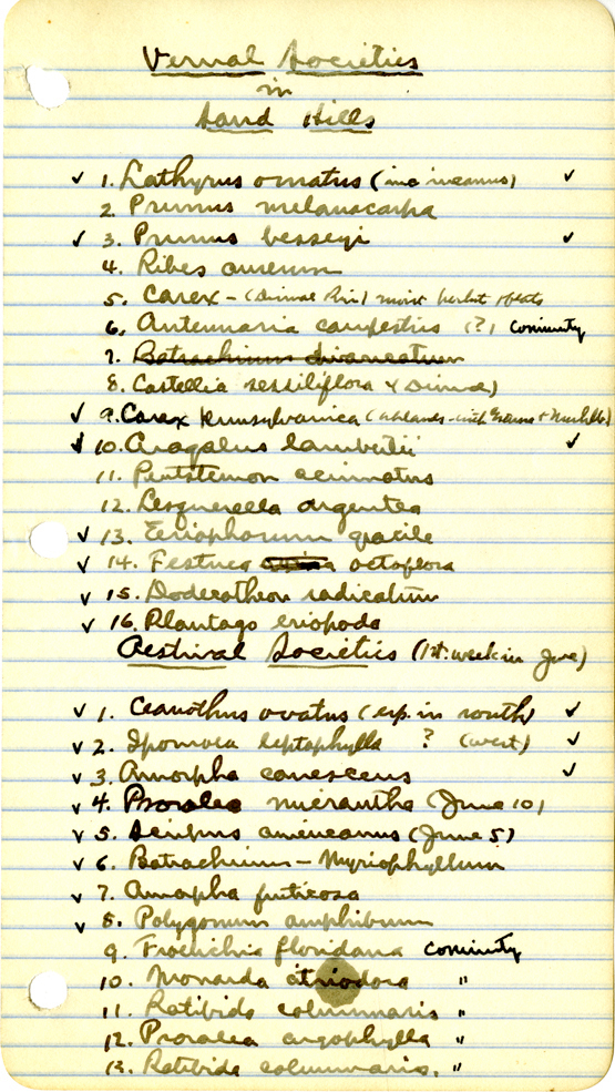116 " Visual Societies in Sand Hills 1. Lathyrus omatus (inc incanus) 2. Prunus melancarpa 3. Prunus besseyi 4. Ribes aureum 5. Carex - (Dismal River) moist pocket flats 6. Antennaria campestris (?) community 7. Batrachium circinatum 8. Castellia sessiliflora (Dismal) 9. Carex pennsylvanica (uplands - with Grasses & Muhlenbergia) 10. Arogalus lambertii 11. Penstemon acimatus 12. Lesquerella argentea 13. Eriophorum gracile 14. Festuca octoflora 15. Dodeoctheon readicatum 16. Plantago eriopoda Aestival Societies (1st. week in June) 1. Ceanothus ovatus (esp. in South) 2. Ipomoea leptophylla ? (west) 3. Amorpha canescens 4. Prosalea micrantha (June 10) 5. Scirpus americanus (June 5) 6. Batrachium - Myriophyllum 7. Amorpha fruticosa 8. Polygonum amphibium 9. Froelichia floridana community 10. Monarda citriodora " 11. Ratibida columnaris " 12. Psoralea argophylla " 13. Ratibida columnaris "