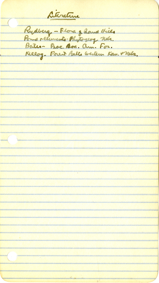 121 " Literature Rydberg - Flora of Sand Hills Pond elements - Phytogeog. Nebr. Bates - Psoe. Soc. Am. For. Kellog - Forest Belts between Kan. & Nebr.