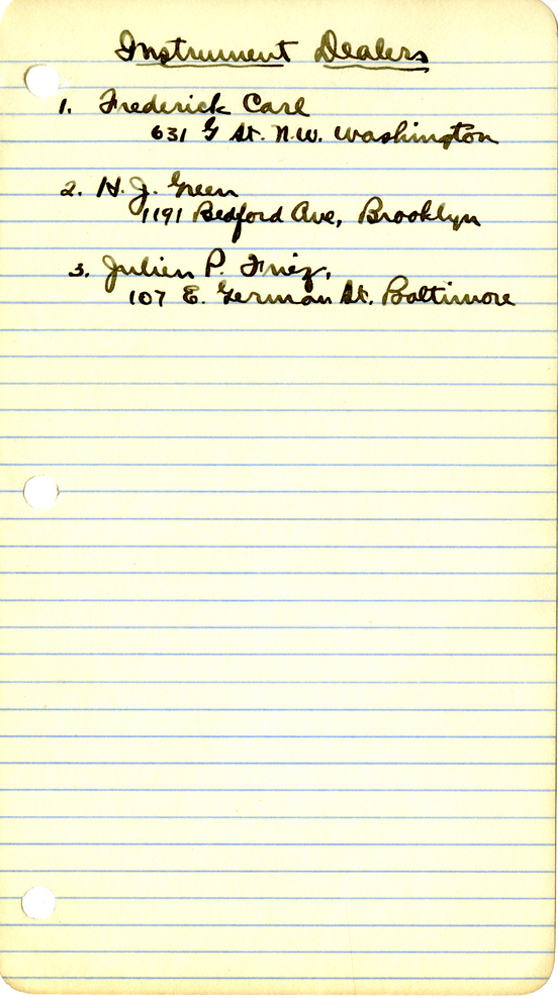 140 " Instrument Dealers 1. Frederick Carl 631 G St. N.W. Washington 2. H.J. Green 1191 Bedford Ave. Brooklyn 3. Julien P. Iniez 107 E. German St. Baltimore