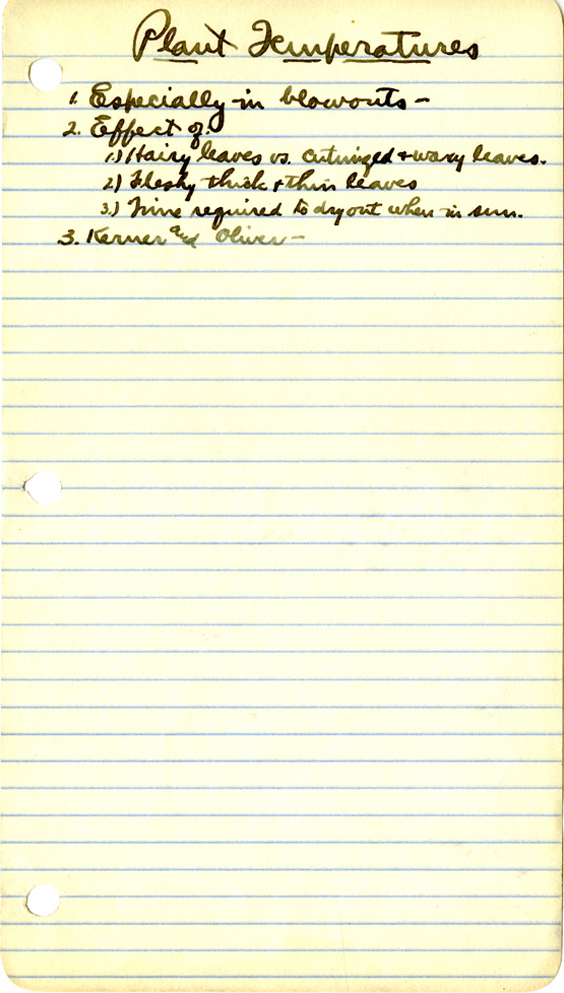 143 " Plant Temperatures 1. Especially in blowouts - 2. Effect of: 1.) Hairy leaves vs. cutunized & wavey leaves. 2. Fleshy thick & thin leaves 3.) Time required to dry out when in sun. 3. Kerver and Oliver -
