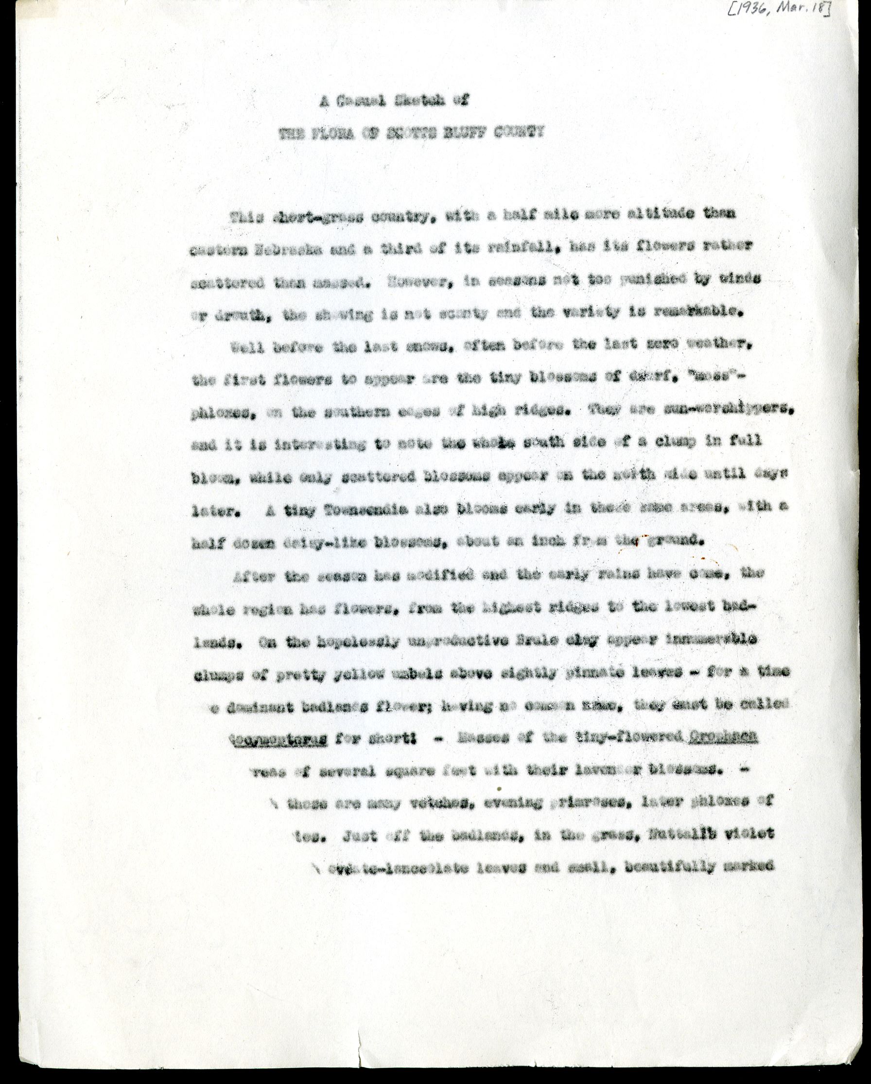 1 A Casual Sketch of THE FLORA OF SCOTTS BLUFF COUNTY This short-grass country, with a half mile more altitude then eastern Nebraska and a third of its rainfall, has its flowers rather scattered than . However, in seasons not too punished by winds or drouth, the showing is not scenty and the variety is remarkable. Well before the last snows, often before the last zero weather, the first flowers to appear are the tiny blossoms of dwarf. "moss"-phloxes, on the southern edges of high ridges. They are sun-worshippers, and it is interesting to note the whole south side of a clump in full bloom, while only scattered blossoms appear on the north side until days later. A tiny Townsendia also blooms early in these same areas, with a half dozen daisy-like blossoms, about an inch form the ground. After the season has modified and the early rains have come, the whole region has flowers, from the highest ridges to the lowest badlands. On the hopelessly unproductive Brule clay appear innumerable clumps of pretty yellow umbels above slightly pinnate leaves -for a time the dominant badlands flower; having common name, they must be called Pseadoeymopterus for short! -Along with these are many vetches, evening primreged, later phloxes of several species. Just off the badlands, in the grass, Nattalf's violet is common, with ovate-leneeolate and small, beautifully marked yellow flowers.