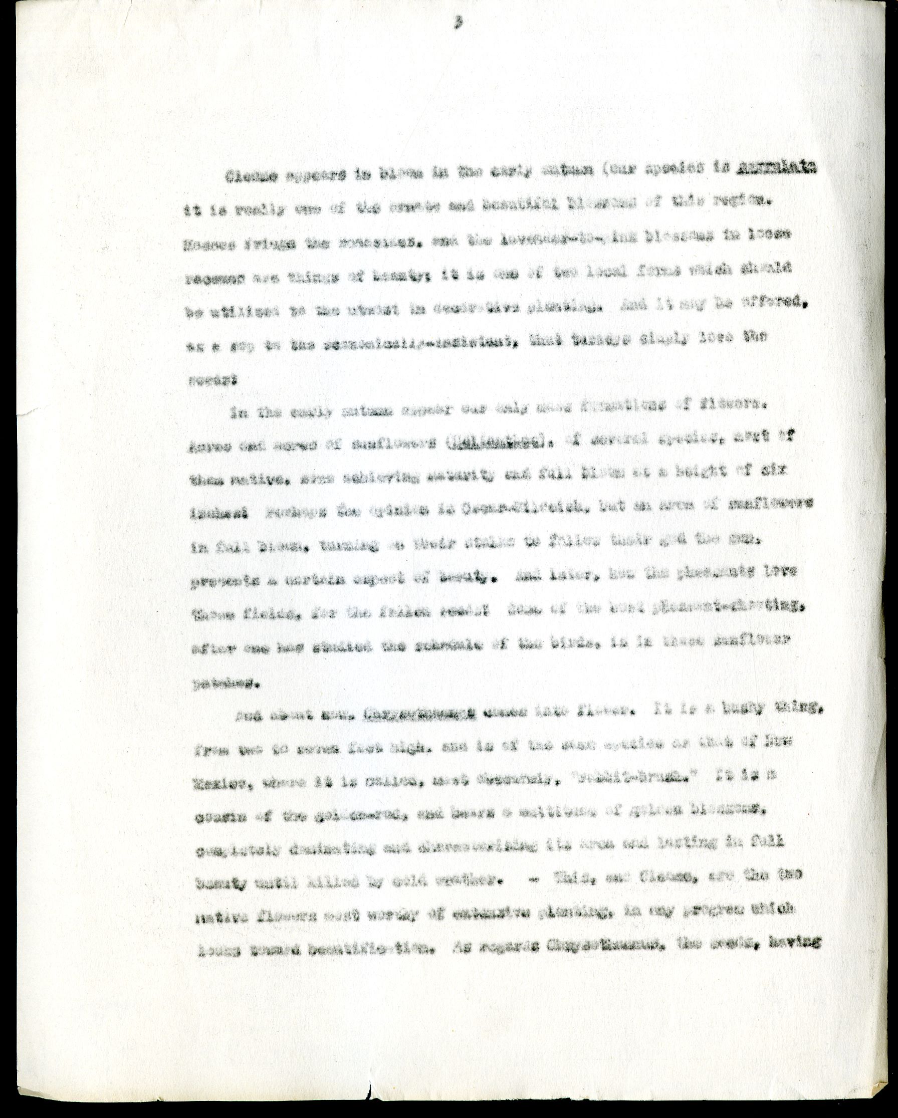 3 Cleome appears in bloom in the early autumn (our species is aerrulata); it is really one of the ornate and beautiful blossoms of this region. Masses fringe the rosesides, and the lavender-to-pink blossoms in loose racemoes are things of beauty; it is one of two local forms which should be utilised to the utmost in decorative planting. And it may be offered, as a sap to the economically-insistent, that turkeys simply love the seeds! In the early autumn appear our only mass formations of flowers. Acres and acres of sunflowers (helianthus), of several species, most of them native, some achieving maturity and full bloom at a height of six inches! Perhaps the opinion is Oscar-Wildeish, but an area of sunflowers in full bloom, turning on their stalks to follow their god and sun, presents a certain aspect of beauty. And later, how the pheasants love these fields, for the fallen seeds! Some of the best pheasant-shooting, after one has studied the schedule of the birds, is in these sunflower patches. And about now, Chrysethamnes comes into flower. It is a bushy thing, from two to seven feet high, and is of the same species as that of New Mexico, where it is called, most obscurely, "rabbit-brush." It is a cousin of the golden-rod, and bears a multitude of golden blossoms, completely dominating and characterising its area and lasting in full beauty until killed by cold weather. - This, and Cleome, are the two native flowers most worthy of extenstive planting, in any program which looks toward beautification. As regards Chrysethsmus, the seeds, having