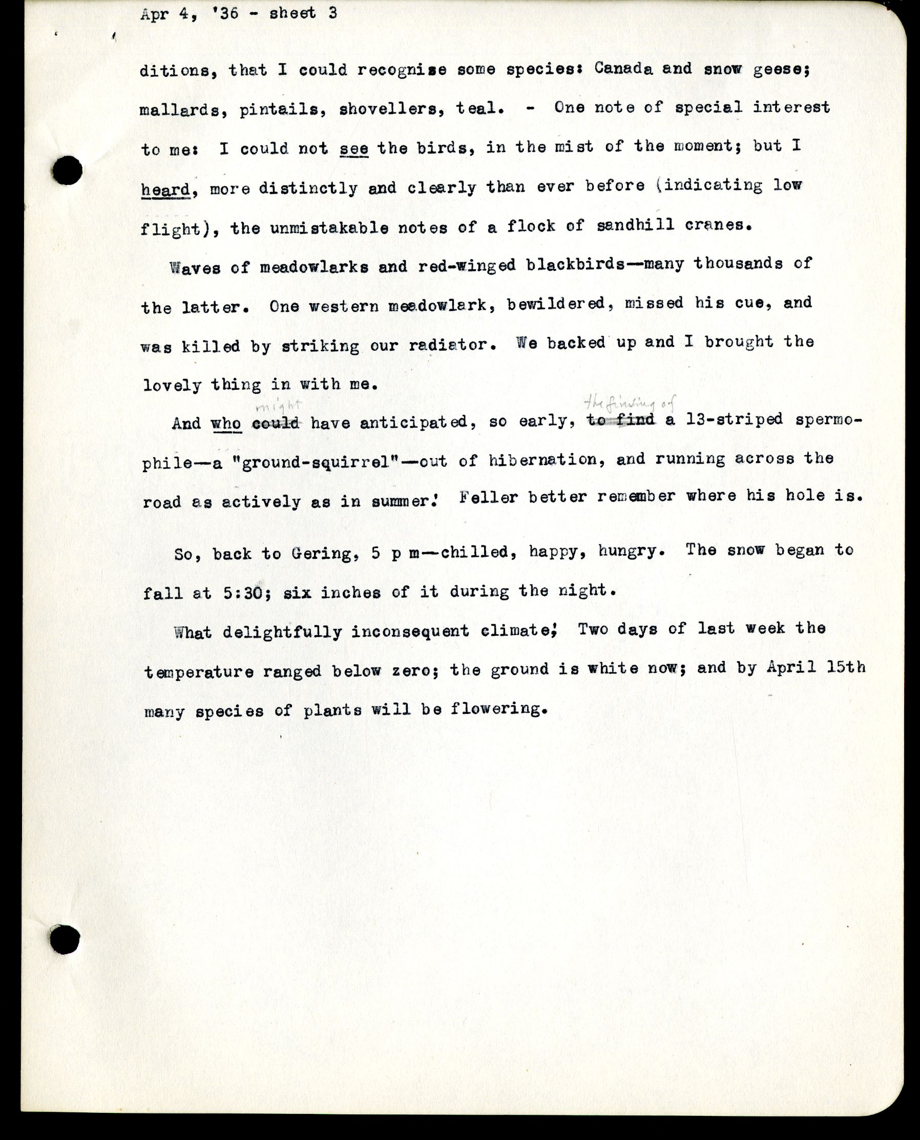 3 Apr 4, '36 - sheet 3 ditions, that I could recognise some species: Canada and snow geese; mallards, pintails, shovellers, teal. - One note of special interest to me: I could not see the birds, in the mist of the moment; but I heard , more distinctly and clearly than ever before (indicating low flight), the unmistakable notes of a flock of sandhill cranes. Waves of meadowlarks and red-winged blackbirds - many thousands of the latter. One western meadowlark, bewildered, missed his cue, and was killed by striking our radiator. We backed up and I brought the lovely thing in with me. And who could might have anticipated, so early, to find the finding of a 13-striped spermophile - a "ground-squirrel" - out of hibernation, and running across the road as actively as in summer! Feller better remember where his hole is. So, back to Gering, 5 p m - chilled, happy, hungry. The snow began to fall at 5:30; six inches of it during the night. What delightfully inconsequent climate! Two days of last week the temperature ranged below zero; the ground is white now; and by April 15th many species of plants will be flowering.