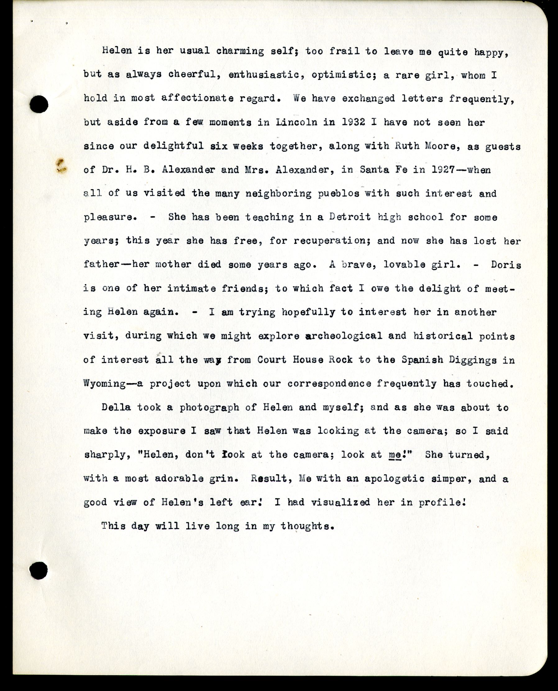 7 Helen is her usual charming self; too frail to leave me quite happy, but as always cheerful, enthusiastic, optimistic; a rare girl, whom I hold in most affectionate regard. We have exchange letters frequently, but aside from a few moments in Lincoln in 1932 I have not seen her since our delightful six weeks together, along with Ruth Moore, as quests of Dr. H.B. Alexander and Mrs. Alexander, in Santa Fe in 1927 - when all of us visited the many neighboring pueblos with such interest and pleasure. - She had been teaching in a Detroit high school for some years; this year she has free, for recuperation; and now she has lost her father - her mother died some years ago. A brave, lovable girl. - Doris is one of her intimate friends; to which fact I owe the delight of meeting Helen again. - I am trying hopefully to interest her in another visit, during which we might explore archeological and historical points of interest all the way from Court House Rock to the Spanish Diggings in Wyoming - a project upon which our correspondence frequently has touched. Della took a photograph of Helen and myself; and as she was about to make the exposure I saw that Helen was looking at the camera; so I said sharply, "Helen, don't look at the camera; look at me!" She turned, with a most adorable grin. Result, Me with an apologetic simper, and a good view of Helen's left ear! I had visualized her in profile! This day will live long in my thoughts.