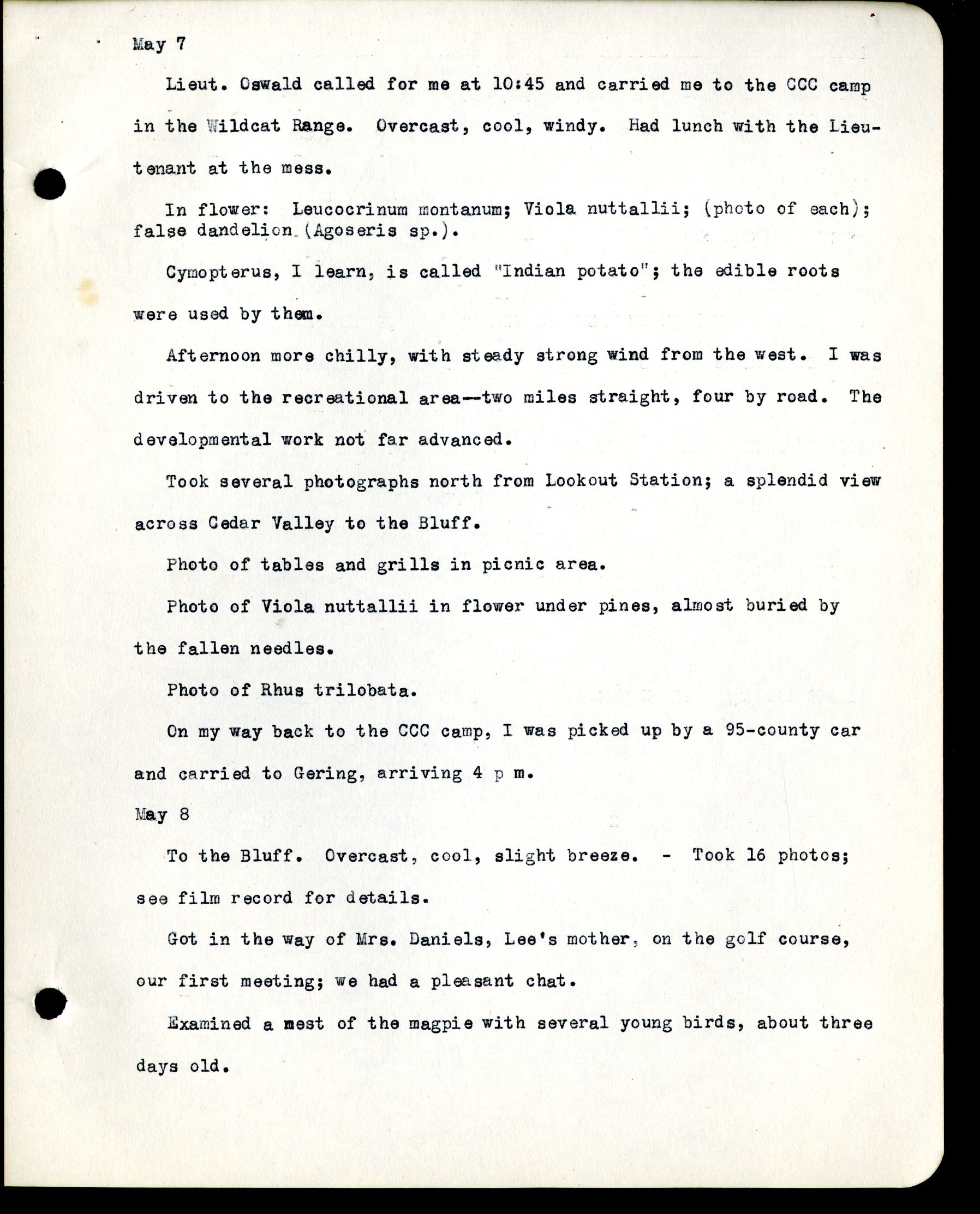 8 May 7 Lieut. Oswald called for me at 10:45 and carried me to the CCC camp in the Wildcat Range. Overcast, cool, windy. Had lunch with the Lieutenant at the mess. In flower: Leucocrinum montanum; Viola nuttallii; (photo of each); false dandelion (Aposeris sp.). Cymopterus, I learn, is called "Indian potato"; the edible roots were used by them. Afternoon more chilly, with steady strong wind from the west. I was driven to the recreational area - two miles straight, four by road. The developmental work not far advanced. Took several photogaphs north from Lookout Station; a splendid view across Cedar Valley to the Bluff. Photo of tables and grills in picnic area. Photo of Viola nuttallii in flower under pines, almost buried by the fallen needles. Photo of Rhus triblobata. On my way back to the CCC camp, I was picked up by a 95-county car and carried to Gering, arriving 4 p m. May 8 To the Bluff. Overcast, cool, slight breeze. - Took 16 photos; see film record for details. Got in the way of Mrs. Daniels, Lee's mother, on the golf course, our first meeting; we had a pleasant chat. Examined a nest of the magpie with several young birds, about three days old.