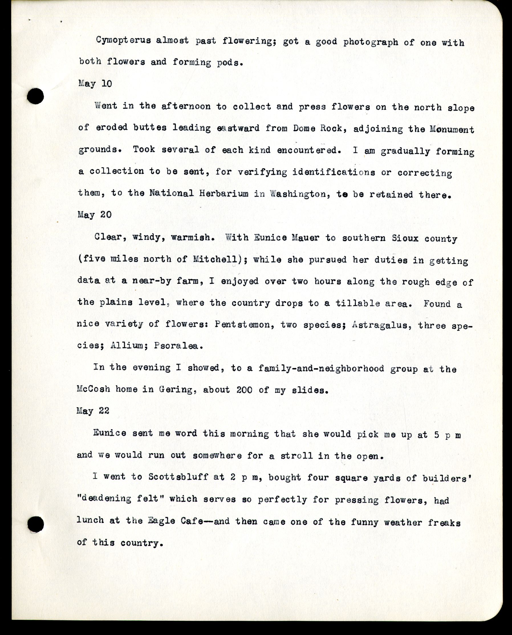9 Cymopterus almost past flowering; got a good photograph of one with both flowers and forming pods. May 10 Went in the afternoon to collect and press flowers on the north slope of eroded buttes leading eastward from Dome Rock, adjoining the Monument grounds. Took several of each kind encountered. I am gradually forming a collection to be sent, for verifying identifications or correcting them, to the National Herbarium in Washington, to be retained there. May 20 Clear, windy, warmish. With Eunice Mauer to southern Sioux county (five miles north of Mitchell); while she pursued her duties in getting data at a near-by farm, I enjoyed over two hours along the rough edge of the plains level, where the country drops to a tillable area. Found a nice variety of flowers: Pentstemon, two species; Astragalus, three species; Allium; Psoralea. In the evening I showed, to a family-and-neighborhood group at the McCosh home in Gering, about 200 of my slides. May 22 Eunice sent me word this morning that she would pick me up at 5 p m and we would run out somewhere for a stroll in the open. I went to Scottsbluff at 2 p m, bought four square yards of builders' "deadening felt" which serves so perfectly for pressing flowers, had lunch at the Eagle Café - and then came one of the funny weather freaks of this country.