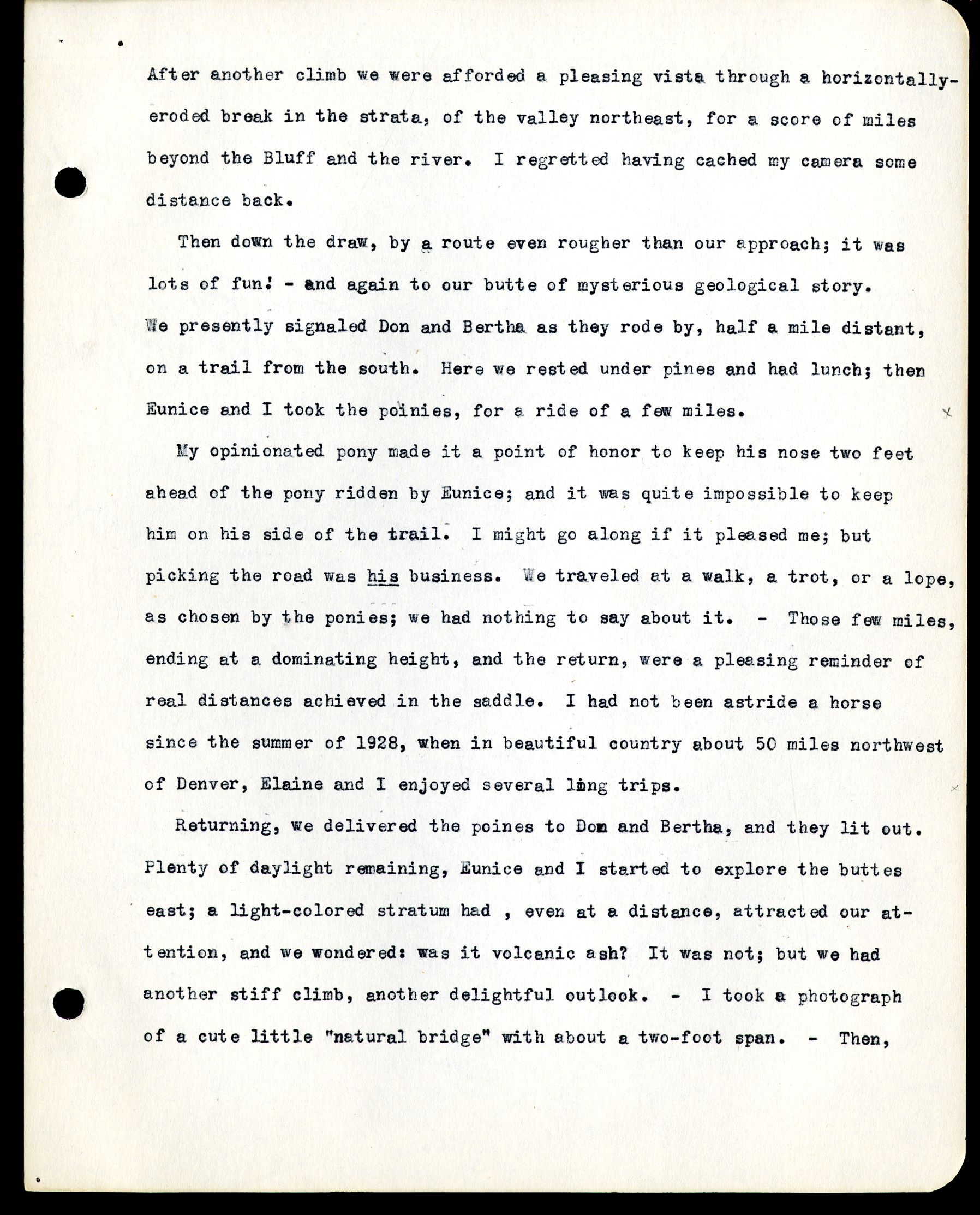 15 After another climb we were afforded a pleasing vista through a horizontally-eroded break in the strata, of the valley northeast, for a score of miles beyond the Bluff and the river. I regretted having cached my camera some distance back. Then down the draw, by a route even rougher than our approach; it was lots of fun! - and again to our butte of mysterious geological story. We presently signaled Don and Bertha as they rode by, half a mile distant, on a trail form the south. Here we rested under pines and had lunch; then Eunice and I took the poinies, for a ride a few miles. My opinionated pony made it a point of honor to keep his nose two feet ahead of the pony ridden by Eunice; and it was quite impossible to keep him on his side of the trail. I might go along it if pleased me; but picking the road was his business. We traveled at a walk, a trot, or a lope, as chosen by the ponies; we had nothing to say about it. - Those few miles, ending at a dominating height, and the return, were a pleasing reminder of real distances achieved in the saddle. I had not been astride a horse since the summer of 1928m when in beautiful country about 50 miles northwest of Denver, Elaine and I enjoyed several long trips. Returning, we delivered the poines to Don and Bertha, and they lit out. Plenty of daylight remaining, Eunice and I started to explore the buttes east; a light-colored stratum had , even at a distance, attracted our attention, and we wondered: was it volcanic ash? It was no; but we had another stiff climb, another delightful outlook. - I took a photograph of a cute little "natural bridge: with about a two-foot span. - Then,