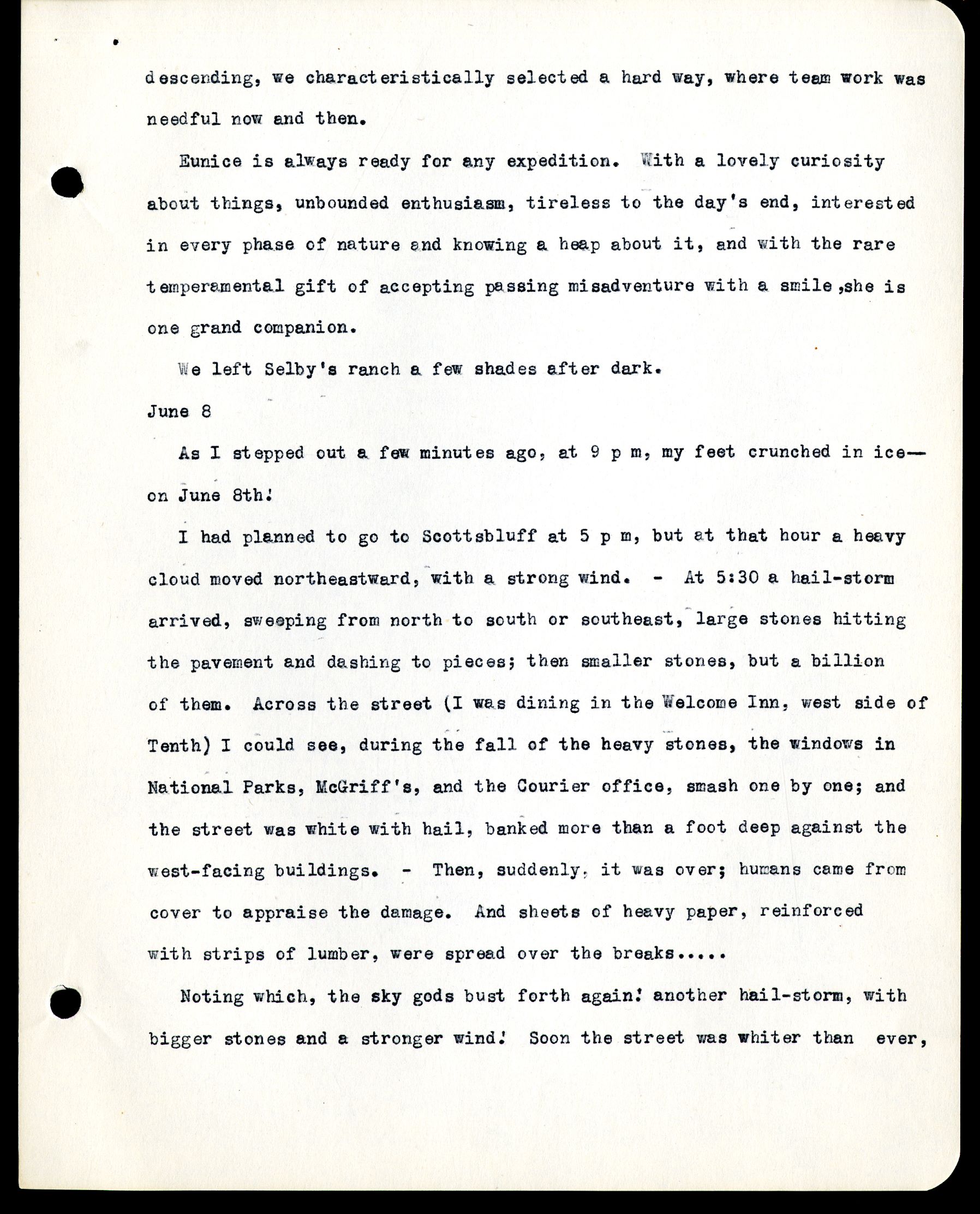 16 Descending, we characteristically selected a hard way, where team work was needful now and then. Eunice is always ready for an expedition. With a lovely curiosity about things, unbounded enthusiasm, tireless to the day's end, interested in every phase of nature and knowing a heap about it, and with the rare temperamental gift of accepting passing misadventure with a smile ,she is one grand companion. We left Selby's ranch a few shades after dark. June 8 As I stepped out a few minutes ago, at 9 p m, my feet crunched in ice - on June 8th! I had planned to go to Scottsbluff at 5 p m, but at that hour a heavy cloud moved northeastward, with a strong wind. - At 5:30 a hail-storm arrived, sweeping from north to south or southeast, large stones hitting the pavement and dashing to pieces; then smaller stones, but a billion of them. Across the street (I was dining in the Welcome Inn, west side of Tenth) I could see, during the fall of the heavy stones, the windows in National Parks, McGriff's, and the Courier office, smash one by one; and the street was white with hail, banked more than a foot deep against the west-facing building. - Then, suddenly, it was over; humans came from cover to appraise the damage. And sheets of heavy paper, reinforced with strips of lumber, were spread over the breaks… Noting which, the sky gods bust forth again! another hail-storm, with bigger stones and a stronger wind! Soon the street was whiter than ever,