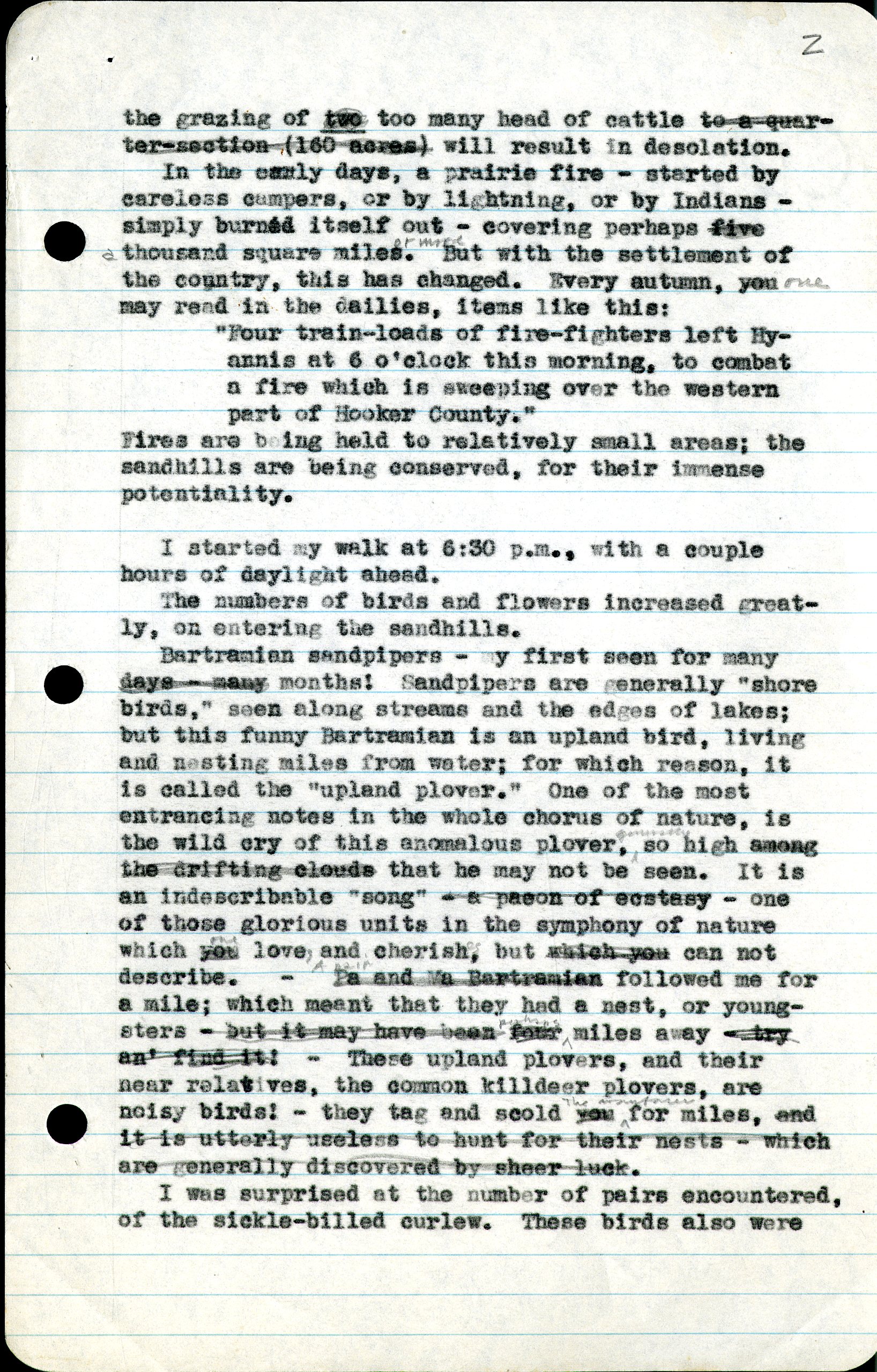 2 the grazing of two too many head of cattle to a quarter-section (160 acres) will result in desolation. In the early days, a prairie fire - started by careless campers, or by lightning, or by Indians - simply burned itself out - covering perhaps five thousand square miles. But with the settlement of the country, this has changed. Every autumn, you may read in the dailies, items like this: "Four train-loads of fire-fighters left Hyannis at 6 o'clock this morning, to combat a fire which is sweeping over the western part of Hooker County." Fires are being held to relatively small areas; the sandhills are being conserved, for their immense potentiality. I started my walk at 6:30 p.m., with a couple hours of daylight ahead. The numbers of birds and flowers increased greatly, on entering the sandhills. Bartreamian sandpipers - my first seen for many days - many months! Sandpipers are generally "shore birds," seen along streams and the edges of lakes; but this funny Bartramian is an upland bird, living and nesting miles from water; for which reason, it is called the "upland plover." One of the most entrancing notes in the whole chorus of nature, is the wild cry of this anomalous plover, so high among the drifting clouds that he may not be seen. It is an indescribable "song" - a paeon of ecstasy - one of those glorious units in the symphony of nature which you love and cherish, but which you can not describe. - Pa and Ma Bartramian followed me for a mile; which meant that they had a nest, or youngsters - but it may have been four miles away - try an' find it! - These upland plovers, and their near relatives, the common killdeer plovers, are noisy birds! - they tag and scold you for miles, and it is utterly useless to hunt for their nests - which are generally discovered by sheer luck. I was surprised at the number of pairs encountered, of the sickle-billed curlew. These birds also