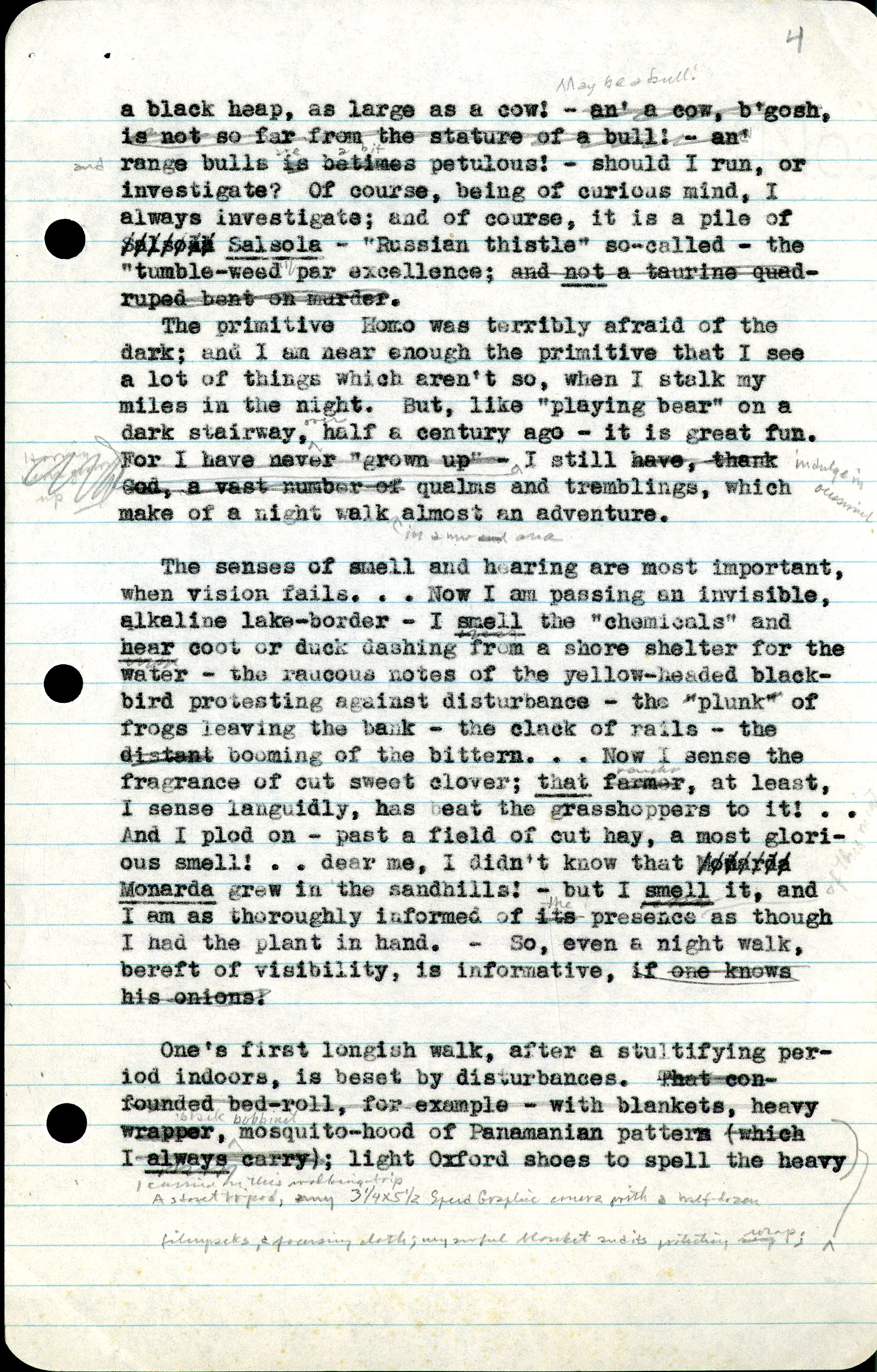 4 a black heap, as large as a cow! - an' a cow, b'gosh, is not so far from the stature of a bull! - an' range bulls is betimes patulous! - should I run, or investigate? Of course, being of curious mind, I always investigate; and of course, it is a pile of Salsola - "Russian thistle" so-called - the "tumblr-weed" par excellence; and not a taurine quadruped bent on murder. The primitive Homo was terribly afraid of the dark; and I am near enough the primitive that I see a lot of things which aren't so, when I stalk my miles in the night. But, like "playing bear" on a dark stairway, half a century ago - it is great fun. For I have never "grown up" - I still have, thank God, a vast number of qualms and tremblings, which make of a night walk almost an adventure. The senses of smell and hearing are most important, when vision fails . . . Now I am passing an invisible, alkaline lake-border - I smell the "chemicals" and hear coot or duck dashing from a shore shelter for the water - the raucous notes of the yellow-headed blackbird protesting against disturbance - the "plunk" of frogs leaving the bank - the clack of rails - the fragrance of cut sweet clover; that farmer, at least, I sense languidly, has beat the grasshoppers to it! . . And I plod on - past a field of guy hay, a most glorious smell! . . dear me, I didn't know that Monarda grew in the sandhills! - but I smell it, and I am as thoroughly informed of its presence as though I had the plant in hand. - So, even a night walk, bereft of visibility, is informative, if one knows his onions. One's first longish walk, after a stultifying period indoors, is beset by disturbances. That confounded bed-roll, for example - with blankets, heavy wrapper, mosquito-hood of Panamanian pattern (which I always carry); light Oxford shoes to spell the heavy
