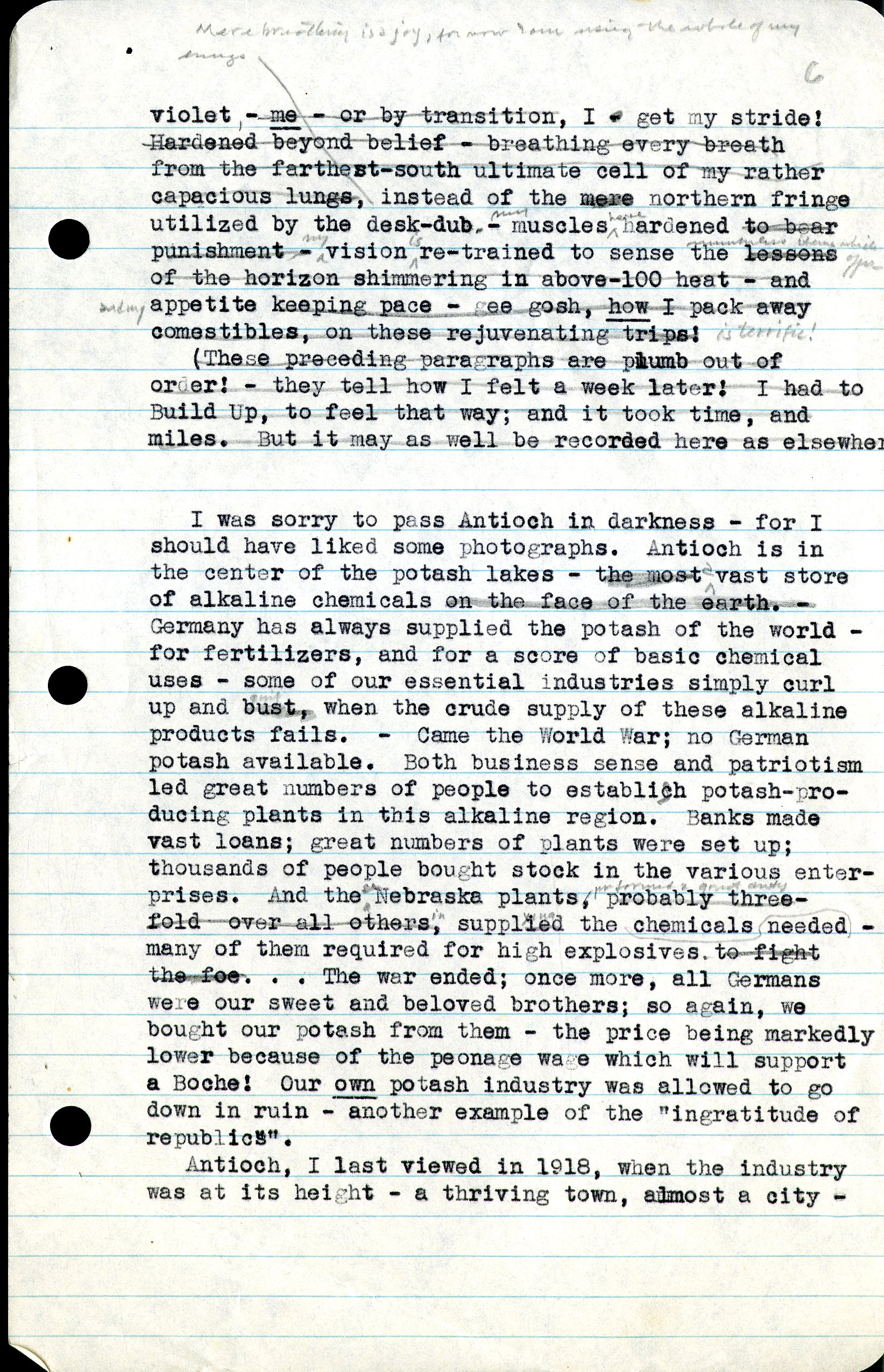 6 violet - me - or by transmission, I - get my stride! Hardened beyond belief - breathing every breath from the farthest-south ultimate cell of my rather capacious lungs, instead of the mere northern fringe utilized by the desk-dub - muscles hardened to bear punishment -vision re-trained to sense the lessons of the horizon shimmering in above-100 heat - and appetite keeping pace - gee gosh, how I pack away comestibles, on these rejuvenating trips ! (The preceding paragraphs are plumb out of order! - they tell how I felt a week later! I had to Build Up, to feel that way; and it took time, and miles. But it may as well be recorded here as elsewhere.) I was sorry to pass Antioch in darkness - for I should have liked some photographs. Antiock is in the center of the potash lakes - the most vast store of alkaline chemicals on the face of the earth. - Germany has always supplied the potash of the world - for fertilizers, and for a score of basic chemical uses - some of our essential industries simply curl up and bust , when the crude supply of these alkaline products fails. - Came the World War; no Gernman potash available. Both business sense and patriotism left great numbers of plants were set up; thousands of people bought stock in the various enterprises. And the Nebraska plants, probably three-fold over all others , supplied the chemicals needed - many of them required for high explosives to fight the foe . . . The war ended; once more, all Germans were our sweet and beloved brothers; so again, we bought our potash from them - the price being markedly lower because of the peonage wage which will support a Boche! Our own potash industry was allowed to go down in ruin - another example of the "ingratitude of republics." Antioch, I last viewed in 1918, when the industry was at its height - a thriving town, almost a city -