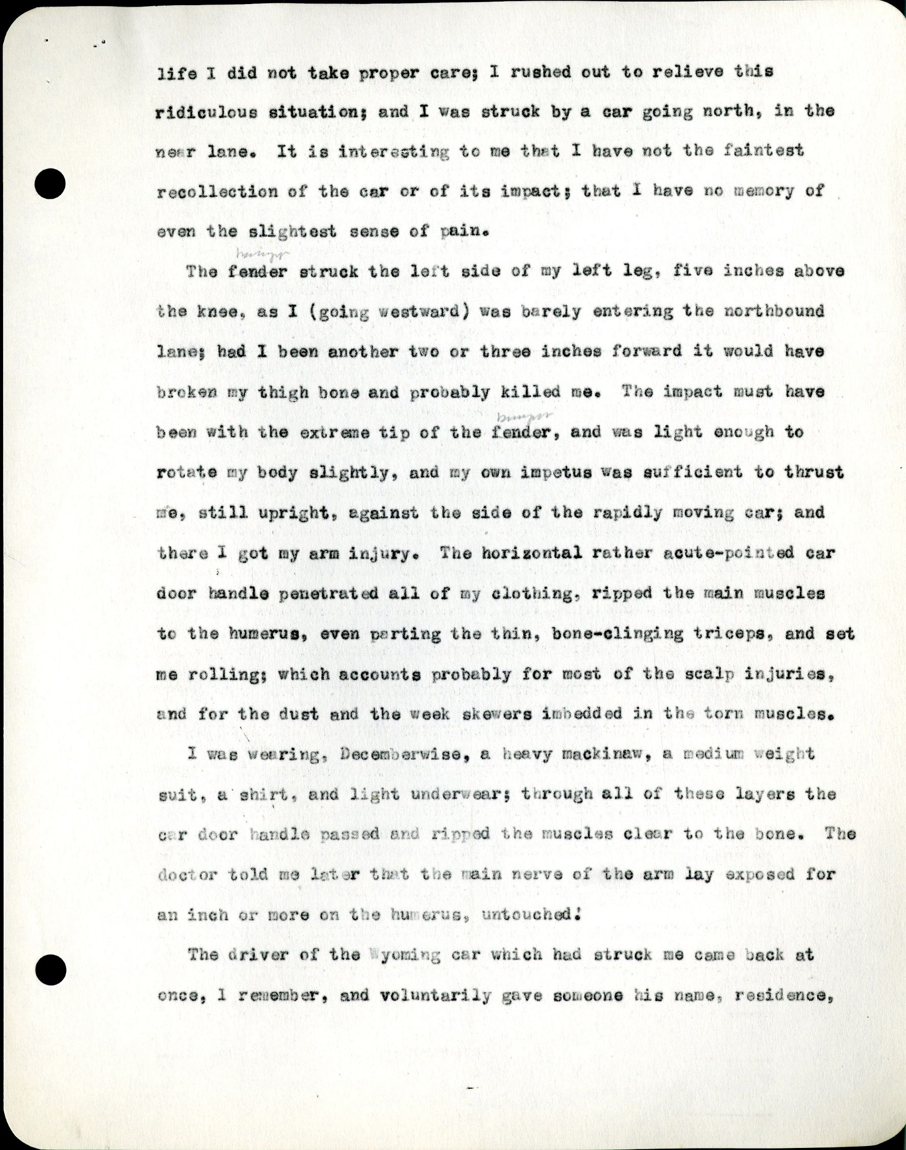 4 life I did not take proper care; I rushed out to relieve this ridiculous situation; and I was struck by a car going north, in the near lane. It is interesting to me that I have not the faintest recollection of the car or of its impact; that I have no memory of even the slightest sense of pain. The fender bumper struck the left side of my left leg, five inches above the knee, as I (going westward) was barely entering the northbound lane; had I been another two or three inches forward it would have broken my thigh bone and probably killed me. The impact must have been with the extreme tip of the fender bumper, and was light enough to rotate my body slightly, and my own impetus was sufficient to thrust me, still upright, against the side of the rapidly moving car; and there I get my arm injury. The horizontal rather acute-pointed car door handle penetrated all of my clothing, ripped the main muscle to the humerus, even parting the thin, bone-clinging triceps, and set me rolling; which accounts probably for most of the scalp injuries, and for the dust and the week skewers imbedded in the torn muscles. I was wearing, Decemberwise, a heavy mackinaw, a medium weight suit, a shirt, and light underwear; through all of these layers the car door handle passed and ripped the muscles clear to the bone. The doctor told me later that the main nerve of the arm lay exposed for an inch or more on the humerus, untouched! The driver of the Wyoming car which had struck me came back at once, I remember, and voluntarily gave someone his name, residence,