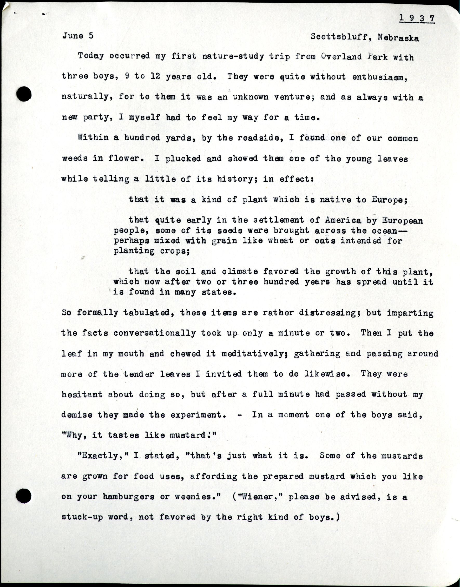 1937 Scottsbluff, Nebraska June 5 Today occurred my first nature-study trip from Overland Park with three boys, 9 to 12 years old. They were quite without enthusiasm, naturally, for to them it was an unknown venture; and as always with a new party, I myself had to feel my way for a time. Within a hundred yards, by the roadside, I found one of our common weeds in flower. I plucked and shoed them one of the young leaves while telling a little of its history; in effect: that it was a kind of plant which is native to Europe; that quite early in the settlement of American by European people, some of its seeds were brought across the ocean -perhaps mixed with grain like wheat or oats intended for planting crops; that the soil and climate favored the growth of this plant, which now after two or three hundred years has spread until it is found in many states. So formally tabulated, these items are rather distressing; but imparting the facts conversationally took up only a minute or two. Then I put the leaf in my mouth and chewed it meditatively; gathering and passing around more of the tender leaves I invited them to do likewise. They were hesitant about doing so, but after a full minute had passed without my demise they made the experiment. -In a moment of the boys said, "Why, it tastes like mustard." "Exactly," I stated, "that's just what it is. Some of the mustards are grown for food uses, affording the prepared mustard which you like on your hamburgers or weenies." ("Wiener," please be advised, is a stuck-up word, not favored by the right kind of boys.)
