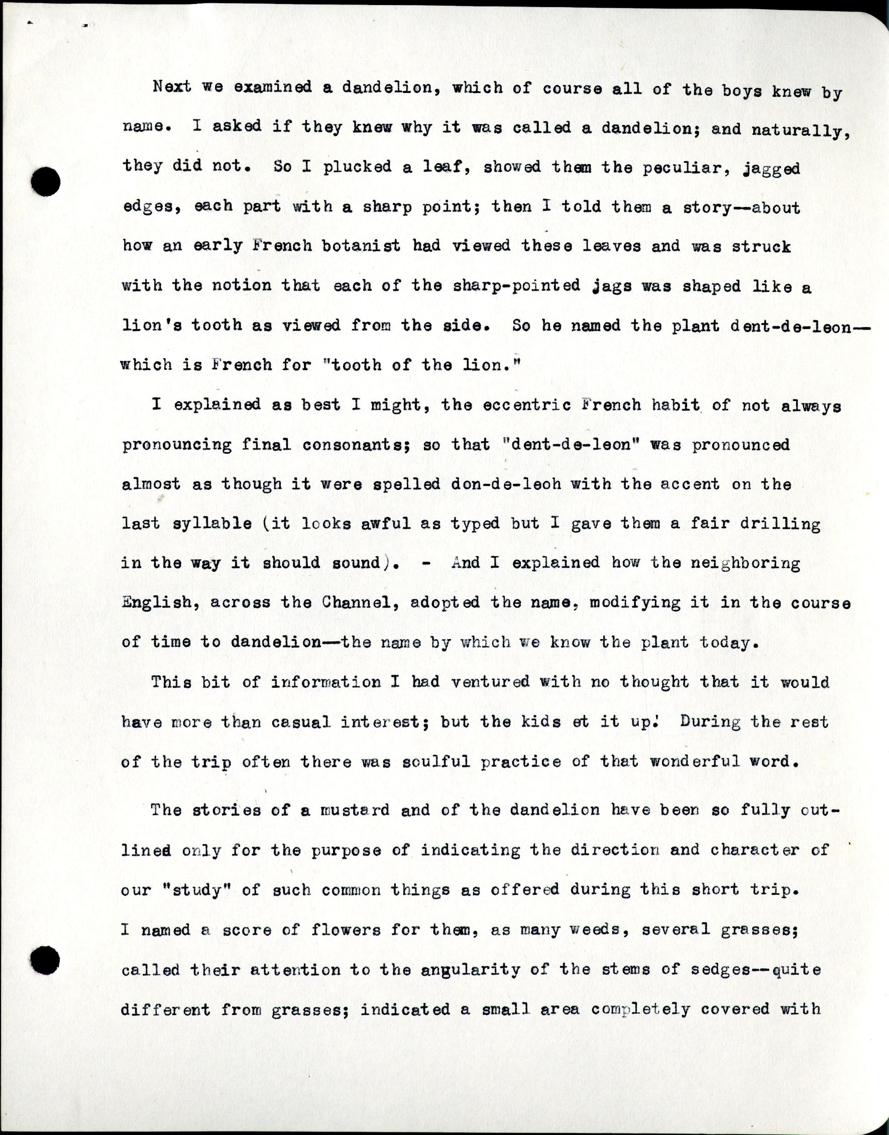 Next we examined a dandelion, which of course all of the boys knew by name. I asked if they knew why it was called a dandelion; and naturally, they did not. So I plucked a leaf, showed them the peculiar, jagged edges, each part with a sharp point; then I told them a story -about how an early French botanist had viewed these leaves and was struck with the notion that each of the sharp-pointed jags was shaped like a lion's tooth as viewed from the side. So he named the plant dent-de-leon -which is French for "tooth of the lion." I explained as best I might, the eccentric French habit of not always pronouncing final consonants; so that "dent-de-leon" was pronounced almost as though it were spelled don-de-leoh with the accent on the last syllable (it looks awful as typed but I gave them a fair drilling in the way it should sound). -And I explained how the neighboring English across the Channel adopted the name modifying it in the course of the trip often there was soulful practice of that wonderful word. The stories of a mustard and of the dandelion have been so fully outlined only for the purpose of indicating the direction and character of our "study" of such common things as offered during this short trip. I named a score of flowers for them, as many weeds, several grasses; called their attention to the angularity of the stems of sedges -quite different from grasses; indicated a small area completely covered with