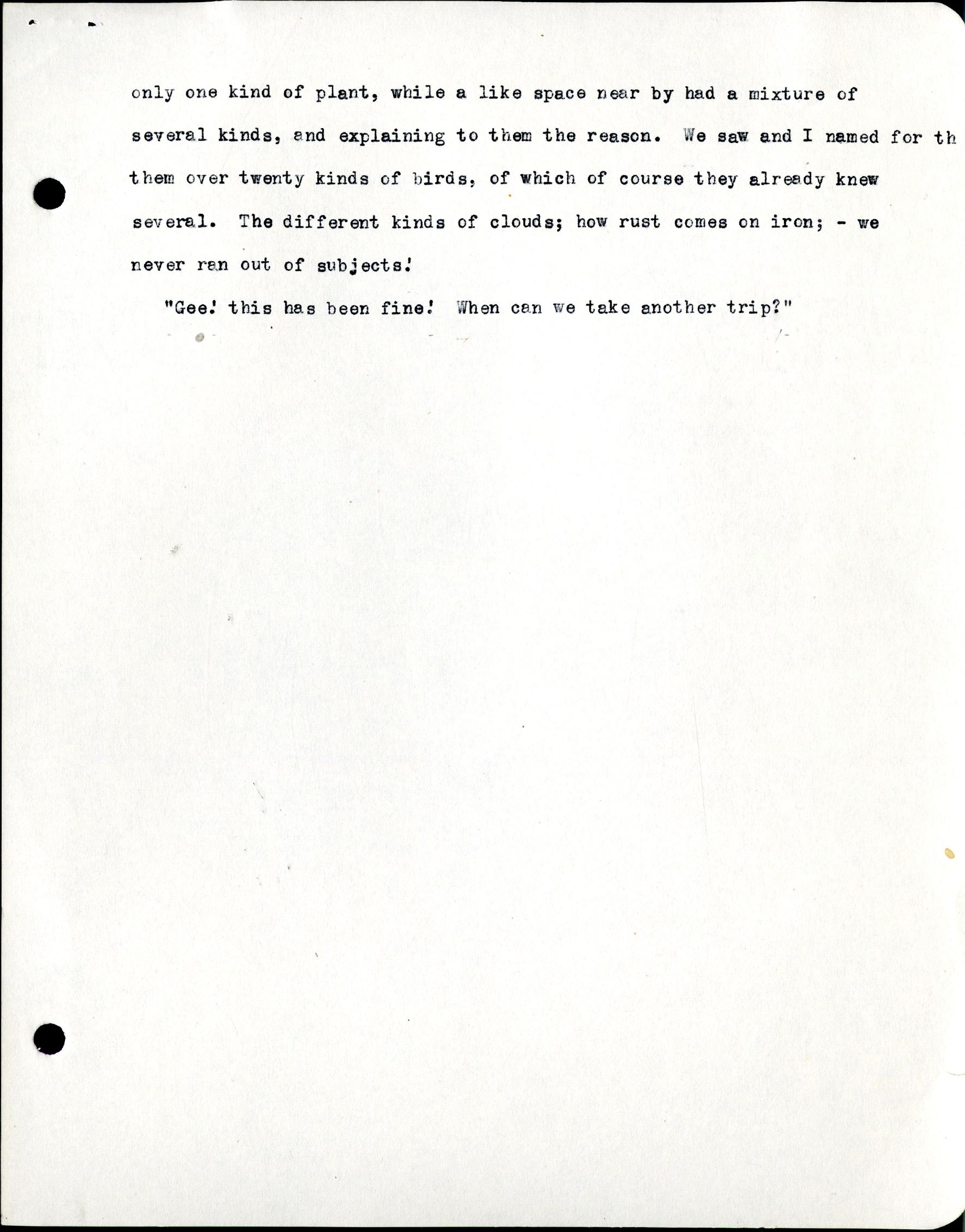 only one kind of plant, while a like space near by had a mixture of several kinds, and explaining to them the reason. We saw and I named for them over twenty kinds of birds, of which of course they already knew several. The different kinds of clouds; how rust comes on iron; -we never ran out of subjects! "Gee! this has been fine! When can we take another trip?"