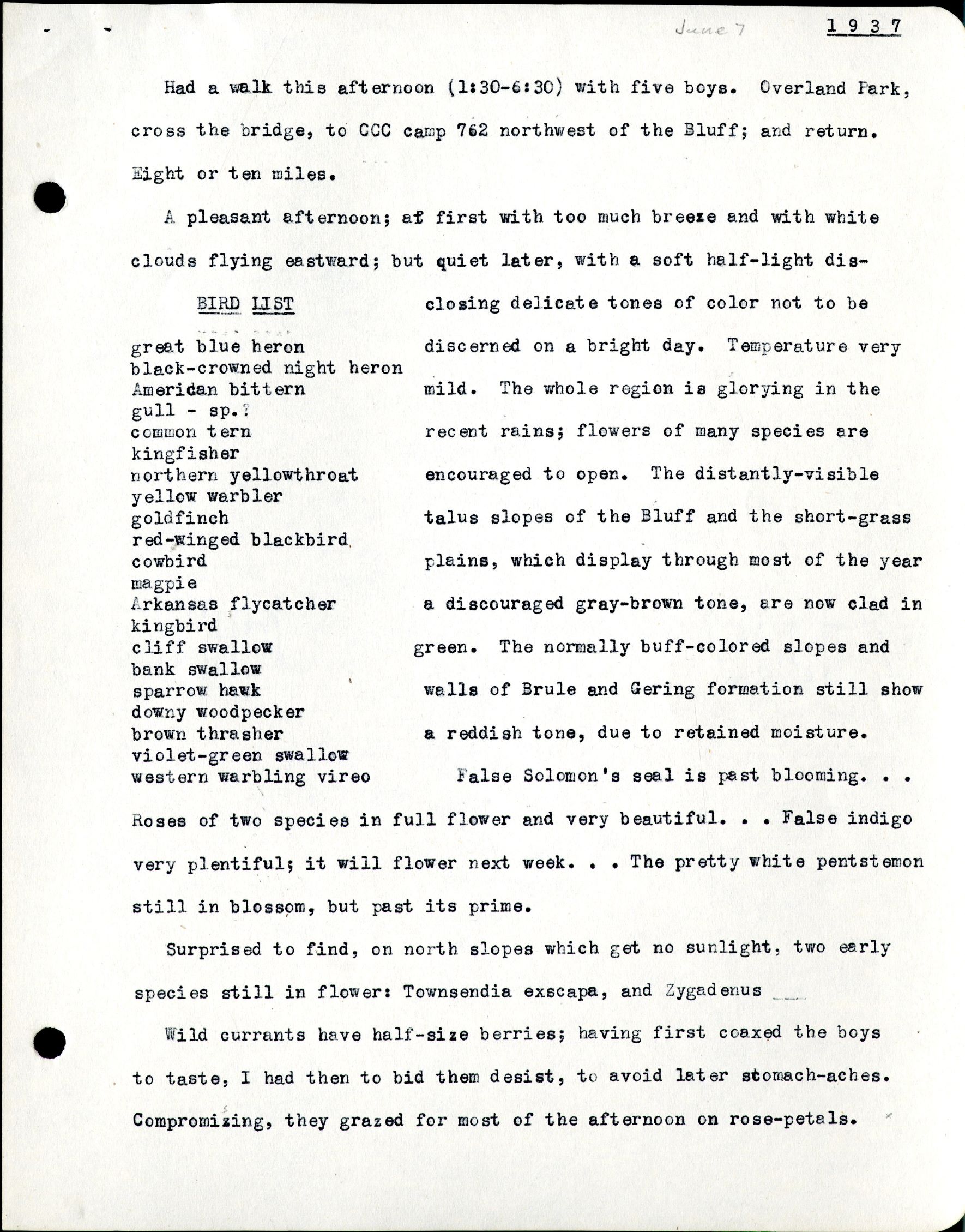 1937 Had a walk this afternoon (1:30-6:30) with five boys. Overland Park, cross the bridge, to CCC camp 762 northwest of the Bluff; and return. Eight or ten miles. BIRD LIST great blue heron black-crowned night heron American bittern gull -sp.? common tern kingfisher northern yellowthroat yellow warbler goldfinch red-winged blackbird cowbird magpie Arkansas flycatcher kingbird cliff swallow bank swallow sparrow hawk downy woodpecker brown thrasher violet-green swallow western warbling vireo A pleasant afternoon; at first with too much breeze and with white clouds flying eastward; but quiet later, with a soft half-light disclosing delicate tones of color not to be discerned on a bright day. Temperature very mild. The whole region is glorying in the recent rains; flowers of many species are encouraged to open. The distantly-visible talus slopes of the Bluff and the short-grass plains, which display through most of the year a discouraged gray-brown tone, are now clad in green. The normally buff-colored slopes and walls of Brule and Gering formation still show a reddish tone, due to retained moisture. False Solomon's seal is past blooming. . . Roses of two species in full flower and very beautiful. . . False indigo very plentiful; it will flower next week. . . The pretty white pentstemon still in bloom, but past its prime. Surprised to find, on north slopes which get no sunlight, two early species still in flower: Townsendia exscapa, and Zygadenus. Wild currants have half-size berries; having first coaxed the boys to taste, I had then to bid them desist, to avoid later stomach-aches. Compromising, they grazed for most of the afternoon on rose-petals.