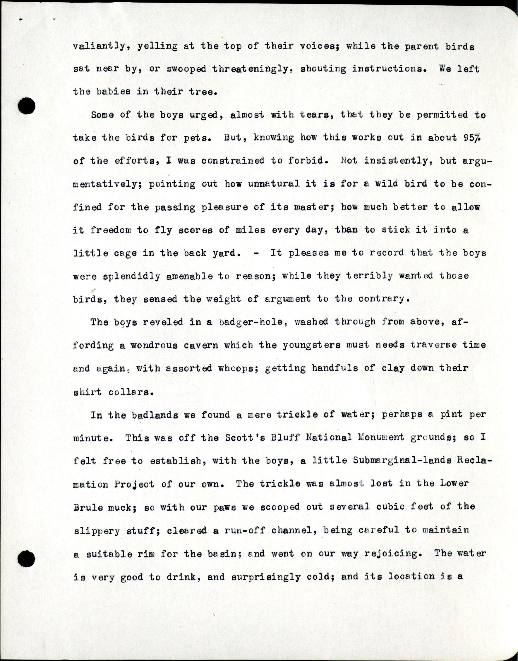 valiantly, yelling at the top of their voices; while the parent birds sat near by, or swooped threateningly, shouting instructions. We left the babies in their tree. Some of the boys urged, almost with tears, that they be permitted to take the birds for pets. But, knowing how this works out in about 95% of the efforts, I was constrained to forbid. Not insistingly, but argumentatively; pointing out how unnatural it is for a wild bird to be confined for the passing pleasure of its master; how much better to allow it freedom to fly scores of miles every day, than to stick it into a little cage in the back yard. -It pleases me to record that the boys were splendidly amenable to reason; while they terribly wanted those birds, they sensed the weight of argument to the contrary. The boys reveled in a badger-hole, washed through from above, affording a wondrous cavern which the youngsters must needs traverse time and again, with assorted whoops; getting handfuls of clay down their shirt collars. In the badlands we found a mere trickle of water; perhaps a pint perminute. This was off the Scott's Bluff National Monument grounds; so I felt free to establish, with the boys, a little Submarginal-lands Reclamation Project of our own. The trickle was almost lost in the Lower Brule much; so with our paws we scooped out several cubic feet of the slippery stuff; cleared a run-off channel, being careful to maintain a suitable rim for the basin; and went on our way rejoicing. The water is very good to drink, and surprisingly cold; and its location is a
