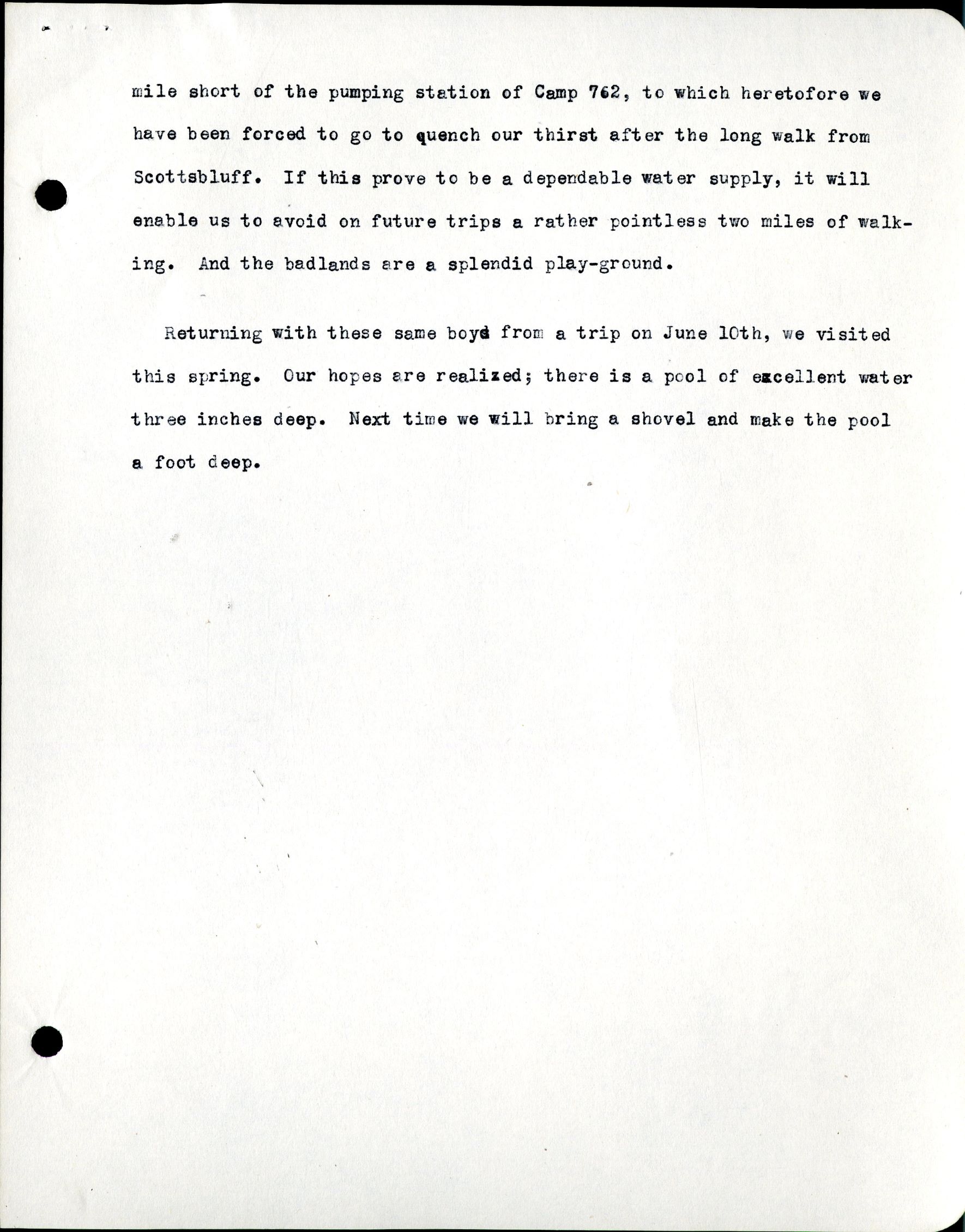 4 mile short of the pumping station of Camp 762, to which heretofore we have been forced to go to quench our thirst after the long walk from Scottsbluff. If this prove to be a dependable water supply, it will enable us to avoid on future trips a rather pointless two miles of walking. And the badlands are a splendid play-ground. Returning with these same boys from a trip on June 10th, we visited this spring. Our hopes are realized; there is a pool of excellent water three inches deep. Next time we will bring a shovel and make the pool a foot deep.