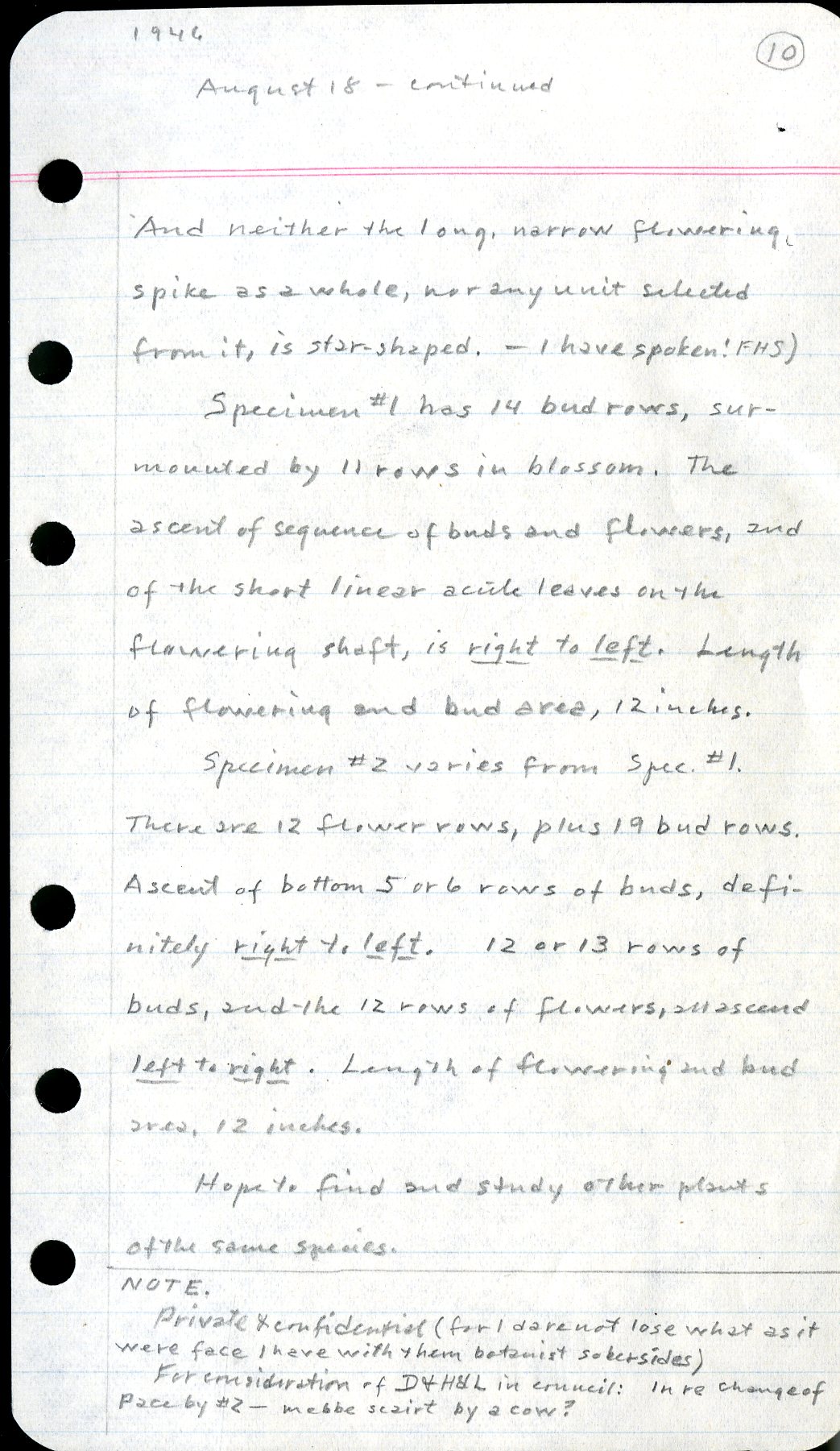 1946 10 August 18 -continued And neither the long narrow flowering spike as a whole, nor any unit selected from it, is star-shaped. -I have spoken! FHS) Specimen #1 has 14 bud rows, surmounted by 11 rows in blossom. The ascent of sequence of buds and flowers, and of the short linear acute leaves on the flowering shaft, is right to left . Length of flowering and bud area, 12 inches. Specimen #2 varies from Spec. #1. There are 12 flower rows, plus 19 bud rows. Ascent of bottom 5 orb rows of buds, definitely right to left . 12 or 13 rows of buds, and the 12 rows of flowers, all ascend left to right . Length of flowering and bud area, 12 inches. Hope to find and study other plants of the same species. ____________________________________________ NOTE. Private + confidential (for I dare not lose what as it were face I have with them botanist sober sides) For consideration of D+H&L in council: In re change of pace by #2 -mebbe scairt by a cow?