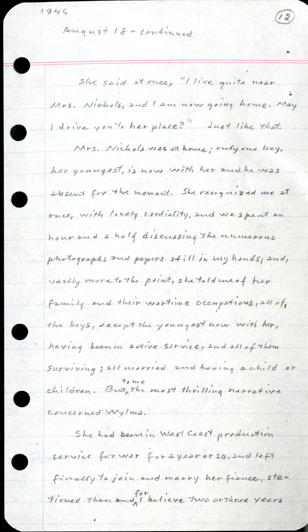 1946 12 August 18 -continued She said at once, "I live quite near Mrs. Nichols, and I am now going home. May I drive you to her place?" Just like that. Mrs. Nichols was at home; only one boy, her youngest is now with her and was absent for the moment. She recognized me at once, with lovely cordiality, and we spent an hour and a half discussing the numerous photographs and papers still in my hands; and, vastly more to the point, she told me of her family and their wartime occupations, and of, the boys, except the youngest now with her, having been in active service, and all of them surviving; all married and having a child or children. But to me the most thrilling narrative concerned Wylma. She had been in West Coast production service for war for a year or so, and left finally to join and marry her fiancé, stationed then and for I believe two or three years
