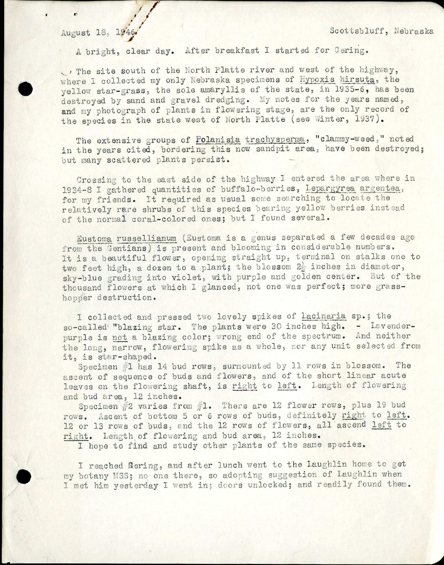 August 18, 1946 Scottsbluff, Nebraska A bright, clear day. After breakfast I started for Gering. The site south of the North Platte river and west of the highway, where I collected my only Nebraska specimens of Hypoxis hirsute, the yellow star grass, the sole amaryllis of the state, in 1935-6, has been destroyed by sand and gravel dredging. My notes for the years named, and my photograph of plants in flowering stage, are the only record of the species in the state west of North Platte (see Winter, 1937). The extensive groups of Polanisia trachysperma, "clammy-weed," noted in the years cited, bordering this now sandpit area, have been destroyed; but scattered plants persist. Crossing to the east side of the highway I entered the area where in 1934-8 I gathered quantities of buffalo-berries, Lepargyrea argentea for my friends. It required as usual some searching to locate the relatively rare shrubs of this species bearing yellow berries instead of the normal coral-colored ones; but I found several. Eustoma russellianum (Eustoma is a genus separated a few decades ago from the Gentians) is present and blooming in considerable numbers. It is a beautiful flower, opening straight up, terminal on stalks one to two feet high, a dozen to a plant; the blossom 2 ½ inches in diameter, sky-blue grading into violet, with purple and golden center. But of the thousand flowers at which I glanced, not one was perfect; more grass-hopper destruction. I collected and pressed two lovely spikes of Lacinaria sp.; the so-called "blazing star. The plants were 30 inches high. -Lavender-purple is not a blazing color; wrong end of the spectrum. And neither the long, narrow flowering spike as a whole, nor any unit selected from it, is star-shaped. Specimen #1 has 14 bud rows, surmounted by 11 rows in blossom. The ascent of sequence of buds and flowers, and of the short linear acute leaves on the flowering shaft, is right to left. Length of flowering and bud area, 12 inches. Specimen #2 varies from #1. There are 12 flower rows, plus 19 bud rows. Ascent of bottom 5 or 6 rows of buds, definitely right to left. 12 or 13 rows of buds, and the 12 rows of flower, all ascend left to right. Length of flowering and bud area, 12 inches. I hope to find and study other plants of the same species. I reached Gering, and after lunch went to the Laughlin home to get my botany MSS; no one there, so adopting suggestion of Laughlin when I met him yesterday I went in; doors unlocked; and readily found them.