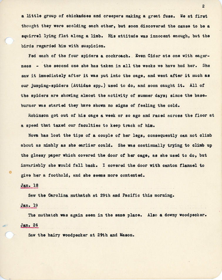 2 a little group of chickadees and creepers making a great fuss. We at first thought they were scolding each other, but soon discovered the cause to be a squirrel lying flat along a limb. His attitude was innocent enough, but the birds regarded him with suspicion. Fed each of the four spiders a cockroach. Even Cider ate one with eagerness - the second one she has taken in all th weeks we have had her. She saw it immediately after it was put into the cage, and went after it much as our jumping-spiders (Attidae spp.) used to do, and soon caught it. All of the spiders are showing almost the activity of summer days; since the baseburner was started they have shown no signs of feeling the cold. Robinson got out of his cage a week or so ago and raced across the floor at a speed that taxed our faculties to keep track of him. Nova has lost the tips of a couple of her legs, consequently can not climb about as nimbly as she earlier could. She was continually trying to climb up the glossy paper which ocvered the door of her cage, as she used to do, but invariably she would fall back. I covered the door with canton flannel to give her a foothold, and she seems more contented. Jan 18. Saw the Carolina nuthatch at 29th and Pacific this morning. Jan 19. The nuthatch was again seen in the same place. Also a downy woodpecker. Jan. 24 Saw the hairy woodpecker at 29th and Mason.