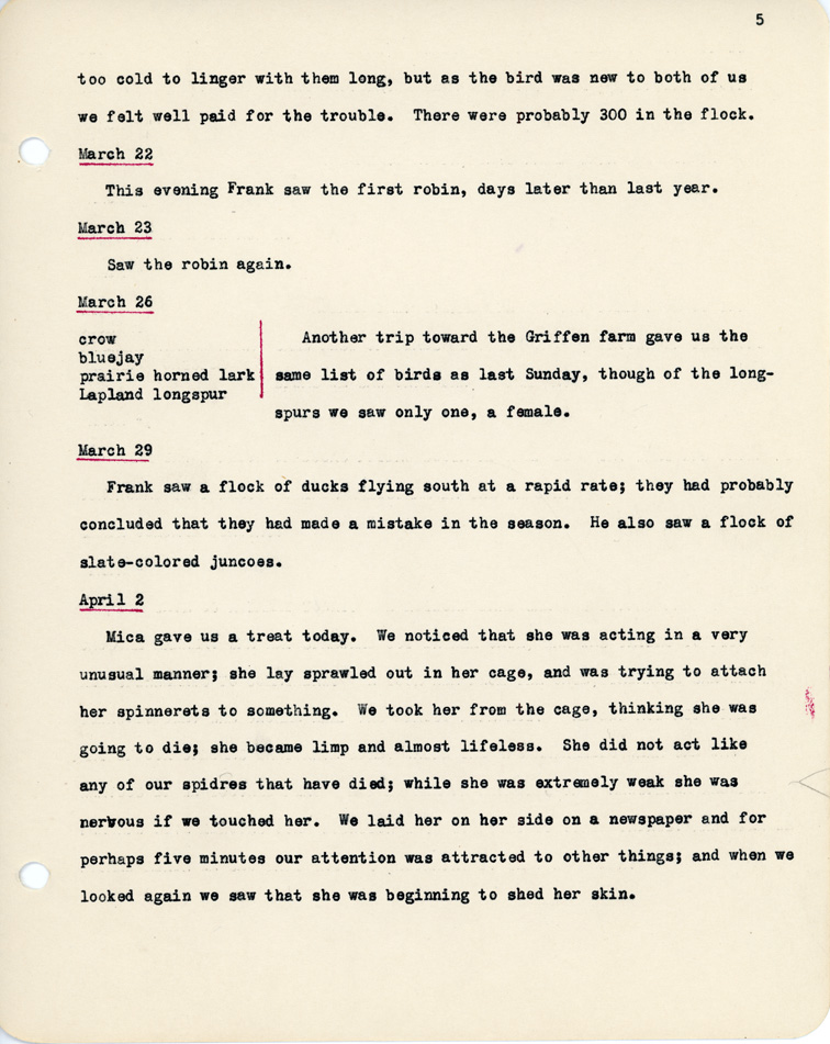 5 Too cold to linger with them long, but as the bird was new to both of us we felt well paid for the trouble. There were probably 300 in the flock. March 22 This evening Frank saw the first robin, days later than last year. March 23 Saw the robin again. March 26 crow bluejay prairie horned lark Lapland longspur Another trip toward the Griffen farm gave us the same list of birds as last Sunday, though of the longspurs we saw only one, a female. March 29 Frank saw a flock of ducks flying south at a rapid rate; they had probably concluded that they had made a mistake in the season. He also saw a flock of slate-colored juncos. April 2 Mica gave us a treat today. We noticed that she was acting in a very unusual manner; she lay sprawled out in her cage, and was trying to attach her spinnerets to something. We took her from the cage, thinking she was going to die; she became limp and almost lifeless. She did not act like any of our spidres that have died; while she was extremely weak she was nervous if we touched her. We laid her on her side on a newspaper and for perhaps five minutes our attention was attracted to other things; and when we looked again we saw that she was beginning to shed her skin.
