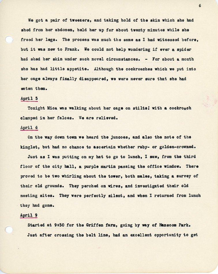 6 We got a pair of tweezers, and taking hold of the skin which she had shed from her abdomen, held her up for about twenty minutes while she freed her legs. The process was much the same as I had witnessed before, but it was new to Frank. We could not help wondering if ever a spider had shed her skin under such novel circumstances. - For about a month she has had little appetite. Although the cockroaches which we put into her cage always finally disappeared, we were never sure that she had eaten them. April 5 Tonight Mica was walking about her cage on stilts! with a cockroach clamped in her falces. We are relieved. April 6 On the way down town we heard the juncos, and also the note of the kinglet, but had no chance to ascertain whether ruby- or golden-crowned. Just as I was putting on my hat to go to lunch, I saw, from the third floor of the city hall, a purple martin passing the office window. There proved to be two whirling about the tower, both males, taking a survey of their old grounds. They perched on wires, and investigated their old nesting sites. They were perfectly silent, and when I returned from lunch they had gone. April 9 Start at 9:50 for the Griffen farm, going by way of Hanscom Park. Just after crossing the belt line, had an excellent opportunity to get