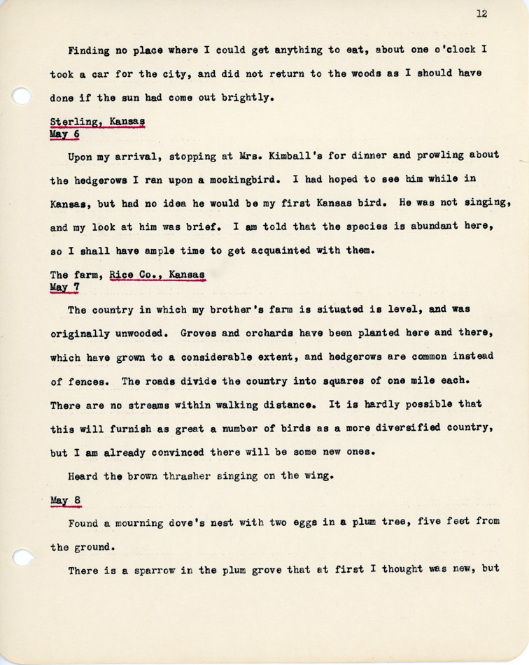 12 Finding no place where I could get anything to eat, about one o'clock I took a car for the city, and did not return to the woods as I should have done if the sun had come out brightly. Sterling, Kansas May 6 Upon my arrival, stopping at Mrs. Kimball's for dinner and prowling about the hedgerows I ran upon a mockingbird. I had hoped to see him while in Kansas, but had no idea he would be my first Kansas bird. He was not singing, and my look at him was brief. I am told that the species is abundant here, so I shall have ample time to get acquainted with them. The farm, Rice Co., Kansas May 7 The country in which my brother's farm is situated is level, and was originally unwooded. Groves and orchards have been planted here and there, which have grown to a considerable extent, and hedgerows are common instead of fences. The roads divide the country into squares of one mile each. There are no streams within walking distance. It is hardly possible that this will furnish as great a number of birds as a more diversified country, but I am already conviced there will be some new ones. Heard the brown thrasher singing on the sing. May 8 Found a mourning dove's nest with two eggs in a plum tree, five feet from the ground. There is a sparrow in the plum grove that at first I thought was new, but
