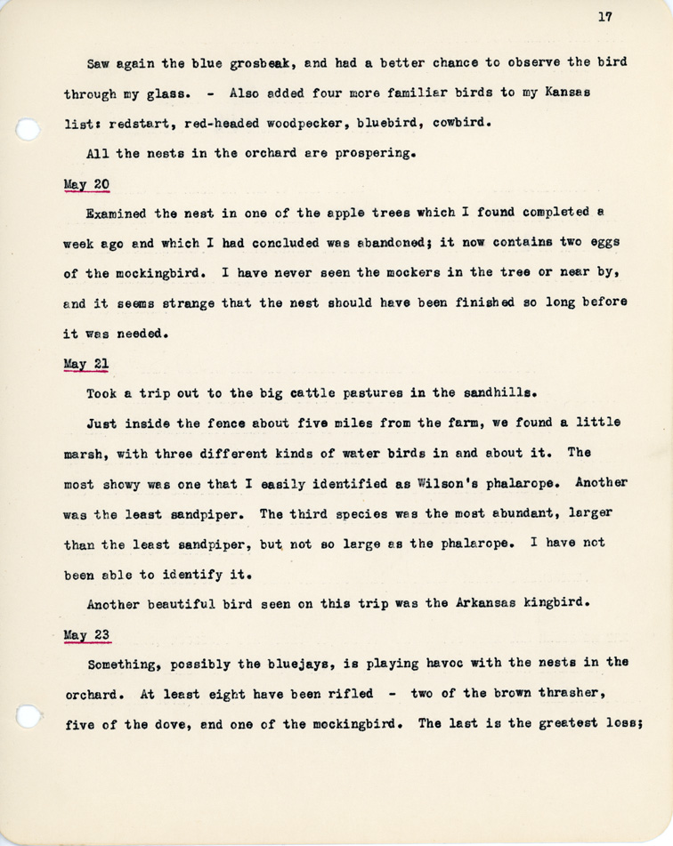 17 Saw again the blue grosbeak, and had a better chance to observe the bird through my glass. - Also added four more familiar birds to my Kansas list: redstart, red-headed woodpecker, bluebird, cowbird. All the nests in the orchard are prospering. May 20 Examined the nest in one of the apple trees which I found completed a week ago and which I had concluded was abandoned; it now contains two eggs of the mockingbird. I have never seen the mockers in the tree or near by, and it seems strange that the nest should have been finished so long before it was needed. May 21 Took a trip out to the big cattle pastures in the sandhills. Just inside the fence about five miles from the farm, we found a little marsh, with three different kinds of water birds in and about it. The most showy was one that easily identified as Wilson's phalarope. Another was the least sandpiper. The third species was the most abundant, larger than the least sandpiper, but not so large as the phalarope. I have not been able to identify it. Another beautiful bird seen on this trip was the Arkansas kingbird. May 23 Something, possibly the bluejays, is playing havoc with the nests in the orchard. At least eight have been rifled - two of the brown thrasher, five of the dove, and one of the mockingbird. The last is the great loss;