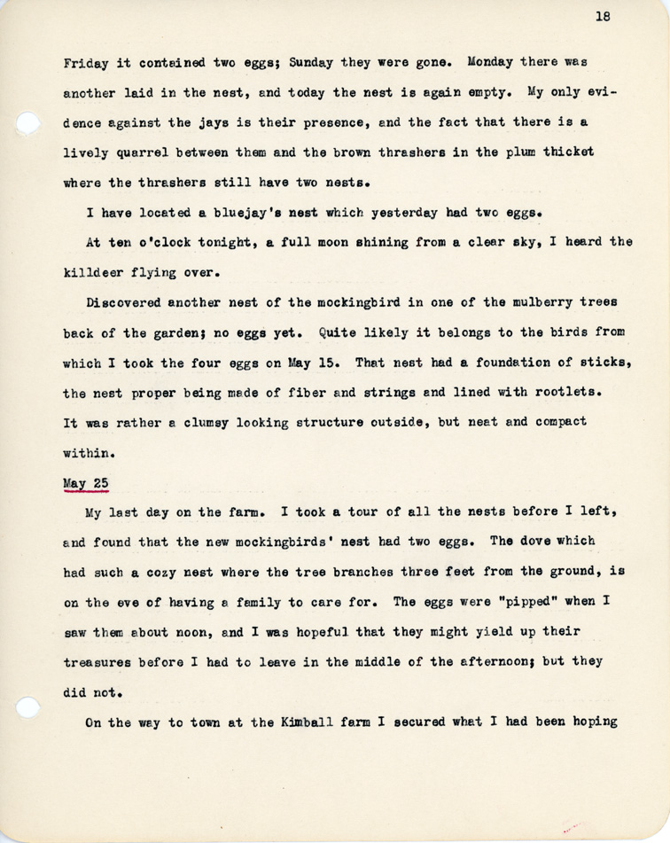 18 Friday it contained two eggs; Sunday they were gone. Monday there was another laid in the nest, and today the nest is again empty. My only evidence against the jays is their presence, and the fact that there is a lively quarrel between them and the brown thrashers in the plum thicket where the thrashers still have two nests. I have located a bluejay's nest which yesterday had two eggs. At ten o'clock tonight, a full moon shining from a clear sky, I heard the killdeer flying over. Discovered another nest of the mockingbird in one of the mulberry trees back of the garden; no eggs yet. Quite likely it belongs to birds from which I took the four eggs on May 15. That nest had a foundation of sticks, the nest proper being made of fiber and strings and lined with rootlets. It was rather a clumsy looking structure outside, but neat and compact within. May 25 My last day on the farm. I took a tour of all the nests before I left, and found that the new mockingbirds' nest had two eggs. The dove which had such a cozy nest where the tree branches three feet from the ground, is on the eve of having a family to care for. The eggs were "pipped" when I saw them about noon, and I was hopeful that they might yield up their treasures before I had to leave in the middl eof the afternoon; but they did not. On the way to town at the Kimball farm I secured what I had been hoping