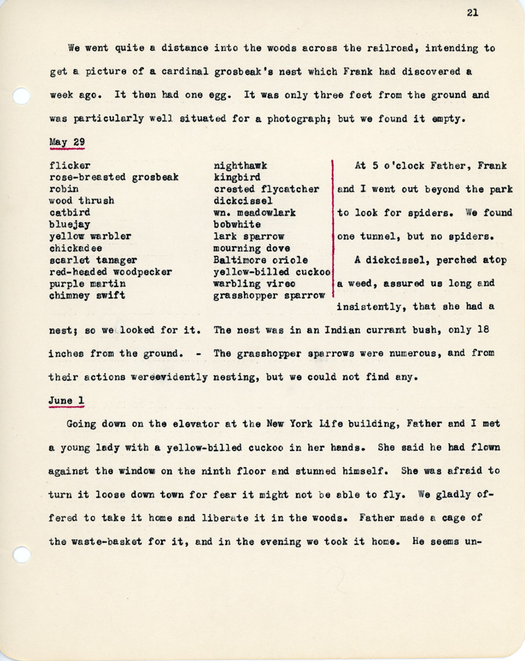 21 We went quite a distance into the woods across the railroad, intending to get a picture of a cardinal grosbeak's nest which Frank had discovered a week ago. It then had one egg. It was only three feet from the ground and was particularly well situated for a photograph; but we found it empty. May 29 flicker nighthawk rose-breasted grosbeak kingbird robin crested flycatcher wood thrush dickcissel catbird wn. meadowlark bluejay bobwhite yellow warbler lark sparrow chickadee mourning dove scarlet tanager Baltimore oriole red-headed woodpecker yellow-billed cuckoo purple martin warbling vireo chimney swift grasshopper sparrow At 5 o'clock Father, Frank and I went out beyond the park to look for spiders. We found one tunnel but no spiders. A dickcissel, perched atop a weed, assured us long and insistently, that she had a nest; so we looked for it. The nest was in an Indian currant bush, only 18 inches from the ground. - The grasshopper sparrows were numerous, and from their actions were evidently nesting, but we could not find any. June 1 Going down on the elevator at the New York Life building, Father and I met a young lady with a yellow-billed cuckoo in her hands. She said he had flown against the window on the ninth floor and stunned himself. She was afraid to turn it loose down town for fear it might not be able to fly. We gladly offered to take it home and liberate it in the woods. Father made a cage of the waste-basket for it, and in the evening we took it home. He seems un-