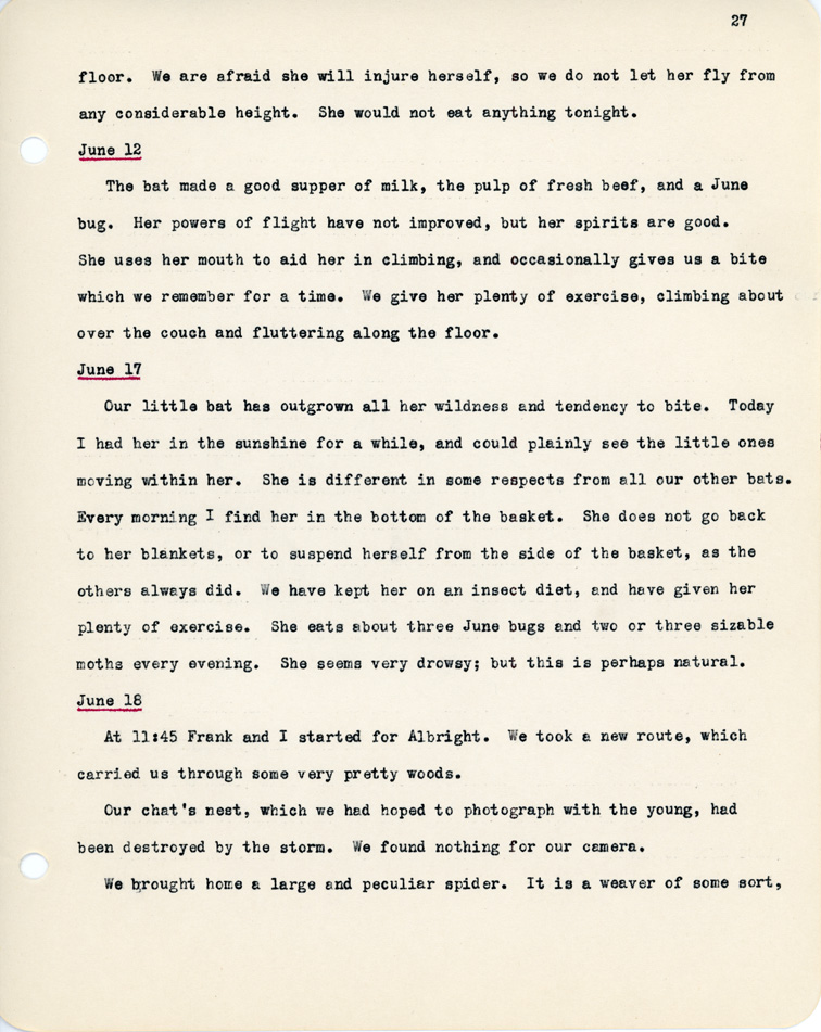 27 floor. We are afraid she will injure herself, so we do not let her fly from any considerable height. She would not eat anything tonight. June 12 The bat made a good supper of milk, the pulp of fresh beef, and a June bug. Her powers of flight have not improved, but her spirits are good. She uses her mouth to aid her in climbing, and occasionally gives us a bite which we remember for a time. We give her plenty of exercise, climbing about over the couch and fluttering along the floor. June 17 Our little bat has outgrown all her wildness and tendency to bite. Today I had her in the sunshine for a while, and could plainly see the little ones moving within her. She is different in some respects from all our other bats. Every morning I find her in the bottom of the basket. She does not go back to her blankets, or to suspend herself from the side of the basket, as the others always did. We have kept her on an insect diet, and have given her plenty of exercise. She eats about three June bugs and two or three sizable moths every evening. She seems very drowsy; but this is perhaps natural. June 18 At 11:45 Frank and I started for Albright. We took a new route, which carried us through some very pretty woods. Our chat's nest, which we had hoped to photograph with the young, had been destroyed by the storm. We found nothing for our camera. We brought home a large and peculiar spider. It is a weaver of some sort,