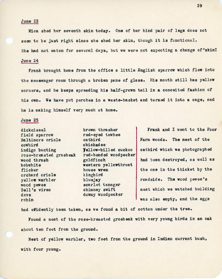 29 June 23 Mica shed her seventh skin today. One of her hind pair legs does not seem to be just right since she shed her skin, though it is functional. She had not eaten for several days, but we were not expecting a change of"skin". June 24 Frank brought home from the office a little English sparrow which flew into the messenger room through a broken pane of glass. His mouth still has yellow corners, and he keeps spreading his half-grown tail in a conceited fashion of his own. We have put perches in a waste-basket and turned it into a cage, and he is making himself very much at home. June 25 dickcissel brown thrasher field sparrow red-eyed towhee Baltimore oriole catbird cowbird chickadee indigo bunting yellow-billed cuckoo rose-breasted grosbeak red-headed woodpecker wood thrush goldfinch bobwhite western yellowthroat flicker house wren orchard oriole kingbird yellow warbler bluejay wood pewee scarlet tanager Bell's vireo chimney swift dove downy woodpecker robin Frank and I went to the Poor Farm woods. The nest of the catbird which we photographed had been destroyed, as well as the one in the thicket by the roadside. The wood pewee's nest which we watched building was also empty, and the eggs had efidently been taken, as we found a bit of cotton under the tree. Found a nest of the rose-breasted grosbeak with very young birds in an oak about ten feet from the ground. Nest of yellow warbler, two feet from the ground in Indian currant bush, with four young.