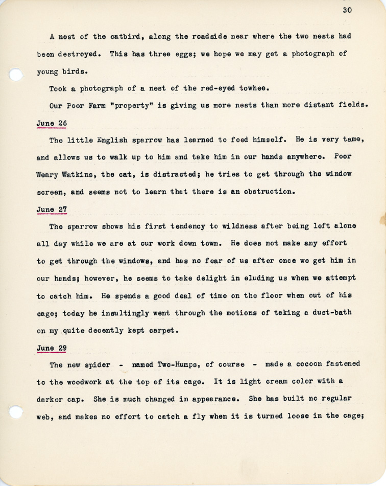 30 A nest of the catbird, along the roadside near where the two nests had been destroyed. This has three eggs; we hope we may get a photograph of young birds. Took a photograph of a nest of the red-eyed towhee. Our Poor Farm "property" is giving us more nests than more distant fields. June 26 The little English sparrow has learned to feed himself. He is very tame, and allows us to walk up to him and take him in our hands anywhere. Poor Weary Watkings, the cat, is distracted; he tries to get through the window screen, and seems not to learn that there is an obstruction. June 27 The sparrow shows his first tendency to wild ness after being left alone all day while we are at our work down town. He does not make any effort to get through the windows, and has no fear of us after once we get him in our hands; however, he seems to take delight in eluding us when we attempt to catch him. He spends a good deal of time on the floor when out of his cage; today he insultingly went through the motions of taking a dust-bath on my quite decently kept carpet. June 29 The new spider - named Two-Humps, of course - made a cocoon fastened to the woodwork at the top of its cage. It is light cream color with a darker cap. She is much changed in appearance. She has built no regular web, and makes no effort to catch a fly when it is turned loose in the cage;