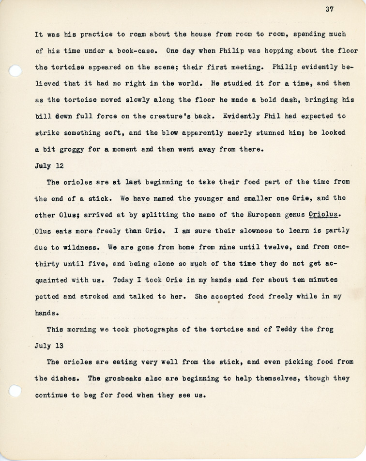 37 It was his practice to roam about the house from room to room, spending much of his time under a book-case. One day when Philip was hopping about the floor the tortoise appeared on the scene; their first meeting. Philip evidently believed that it had no right in the world. He studied it for a time, and then as the moved slowly along the floor he made a bold dash, bringing his bill down full force on the creature's back. Evidently Phil had epected to strike something soft, and the blow apparently nearly stunned him; he looked a bit groggy for a moment and then went away from there. July 12 The orioles are at last beginning to take their food part of the time from the end of a stick. We have named the younger and smaller on Orie, and the other Olus; arrived at by splitting the name of the European genus Oriolus. Olus eats more freely than Orie. I am sure their slowness to learn is partly due to wildness. We are gone from home from nine until twelve, and from one-thirty until five, and being alone so much of the time they do not get acquainted with us. Today I took Orie in my hands and for about ten minutes petted ad stroked and talked to her. She accepted food freely while in my hands. This morning we took photographs of the tortoise and of Teddy the frog July 13 The orioles are eating very well from the stick, and even picking food from the dishes. The grosbeaks also are beginning to help themselves, though they continue to beg for food when they see us.