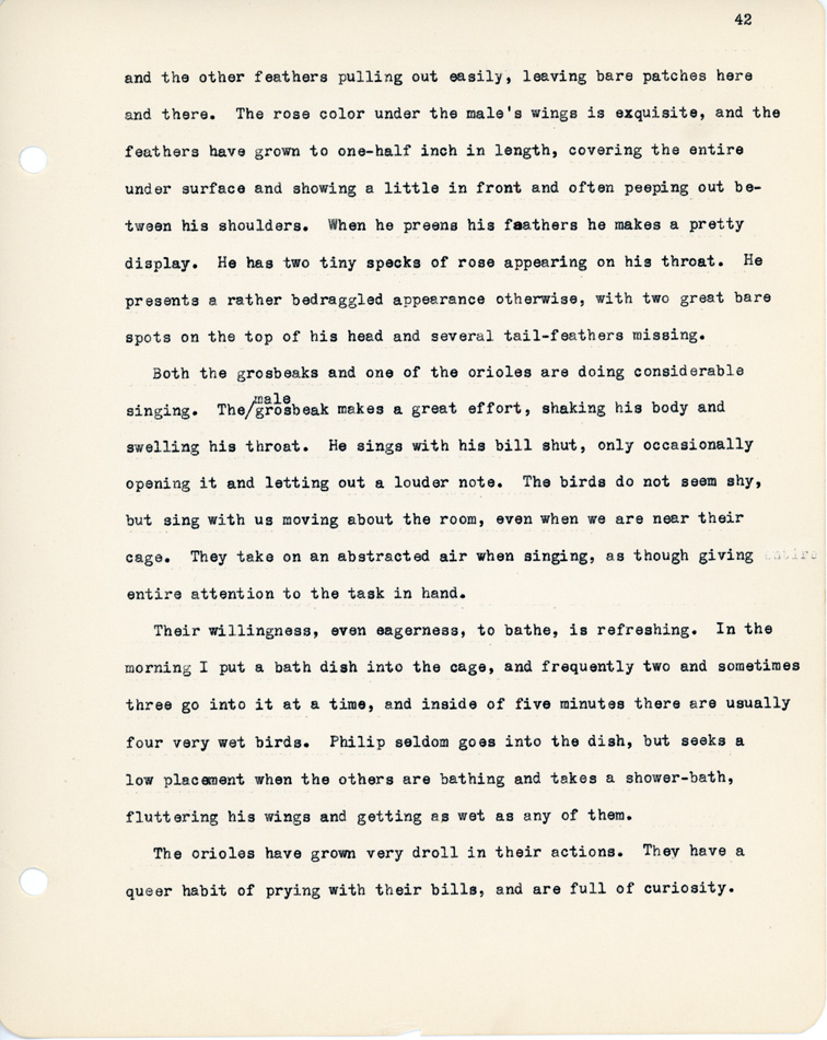 42 and the other feathers pulling out easily, leaving bare patches here and there. The rose color under the male's wings is exquisite, and the feathers have grown to one-half inch in length, covering the entire under surface and showing a little in front and often peeping out between his shoulders. When he preens his feathers he makes a pretty display. He has two tiny specks of rose appearing on his throat. He presents a rather bedraggled appearance otherwise, with two great bare spots on the top of his head and several tail-feathers missing. Both the grosbeaks and one of the orioles are doing considerable singing. The/male grosbeak makes a great effort, shaking his body and swelling his throat. He sings with his bill shut, only occasionally opening it and letting out a louder note. The birds do not seem shy, but sing with us moving about the room, even when we are near their cage. They take on an abstracted air when singing, as though giving entire attention to the task in hand. Their willingness, even eagerness, to bathe, is refreshing. In the morning I put a bath dish into the cage, and frequently two and sometimes three go into it at a time, and inside of five minutes there are usually four very wet birds. Philip seldom goes into the dish, but seeks a low placement when the others are bathing and takes a shower-bath, fluttering his wings and getting as wet as any of them. The orioles have grown very droll in their actions. They have a queer habit of prying with their bills, and are full of curiosity.
