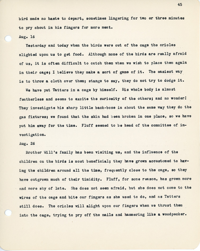 45 bird made no haste to depart, sometimes lingering for two or three minutes to pry about in his fingers for more meat. Aug. 16 Yesterday and today when the birds were out of the cage the orioles alighted upon us to get food. Although none of the birds are really afraid of us, it is often difficult to catch them when we wish to place them again in their cage; I believe they make a sort of game of it. The easiest way is to throw a cloth over them; stange to say, they do not try to dodge it. We have put Tatters in a cage by himself. His whole body is almost featherless and seems to excite the curiosity of the others; and no wonder! They investigate his sharp little back-bone in about the same way they do the gas fixtures; we found that the skin had been broken in one place, so we have put him away for the time. Fluff seemed to be head of the committee of investigation. Aug. 26 Brother Will's family has been visiting us, and the influence of the children on the birds is most beneficial; they have grown accustomed to having the children around all the time, frequently close to the cage, so they have outgrown much of their timidity. Fluff, for some reason, has grown more and more shy of late. She does not seem afraid, but she does not come to the wires of the cage and bit our fingers as she used to do, and as tatters still does. The orioles will alight upon our fingers when we thrust them into the cage, trying to pry off the nails and hammering like a woodpecker.