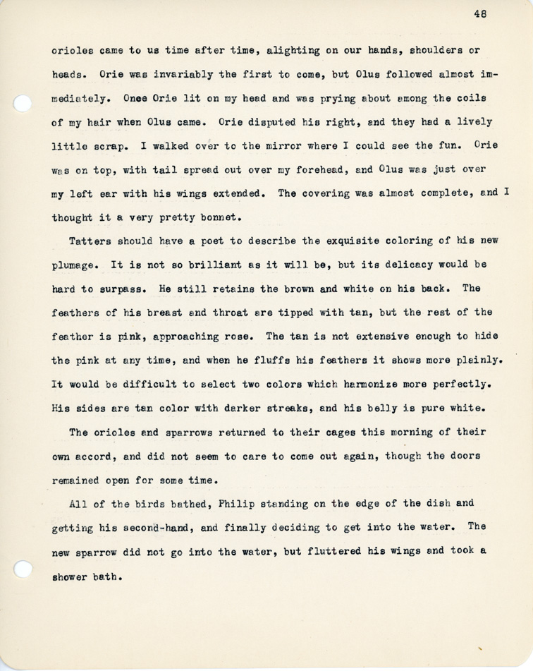48 orioles came to us time after time, alighting on our hands, shoulders or heads. Orie was invariably the first to come, but Olus followed almost immediately. Once Orie lit on my head and was prying about among the coils of my hair when Olus came. Orie disputed his right, and they had a lively little scrap. I walked over to the mirror where I could see the fun. Orie was on top, with tail spread out over my forehead, and Olus was just over my left ear with his wings extended. The covering was almost complete, and I thought it a very pretty bonnet. Tatters should have poet to describe the exquisite coloring of his new plumage. It is not so brilliant as it will be, but its delicacy would be hard to surpass. He still retains the brown and white on his back. The feathers of his breast and throat are tipped with tan, but rest of the feather is pink approaching rose. The tan is not extensive enough to hide the pink at any time, and when he fluffs his feathers it shows more plainly. It would be difficult to select two colors which harmonize more perfectly. His sides are tan color with darker streaks, and his belly is pure white. The orioles and sparrows returned to their cages this morning of their own accord, and did not seem to care to come out again, though the doors remained open for some time. All of the birds bathed, Philip standing on the dish and getting his second-hand, and finally deciding to get into the water. The new sparrow did not go into the water, but fluttered his wings and took a shower bath.