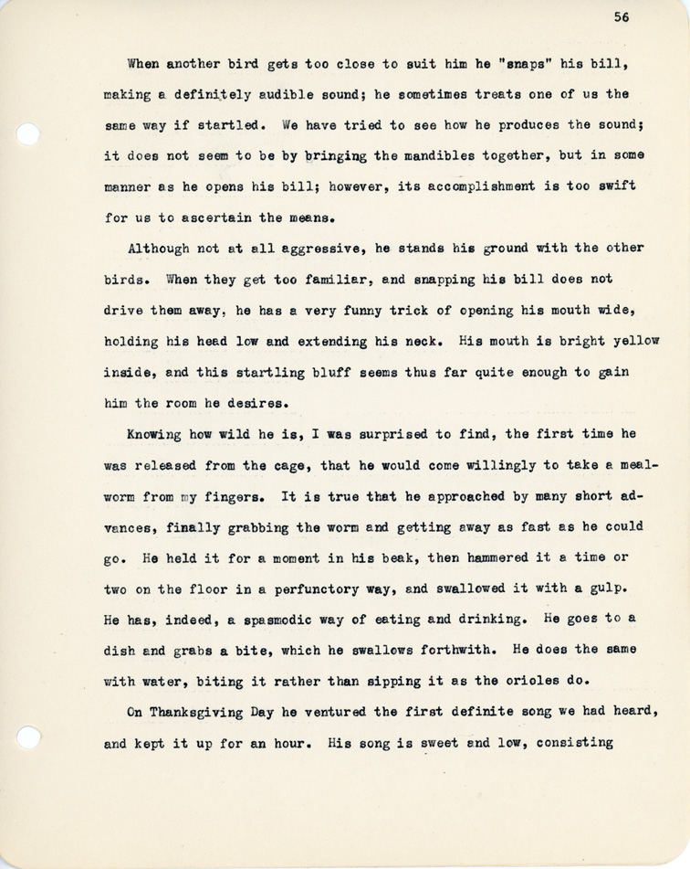 56 When another bird gets too close to suit him he "snaps" his bill, making a definitely audible sound; he sometimes treats one of us the same way if startled. We have tried to see how he produces the sound; it does not seem to be by bringing the mandibles together, but in some manner as he opens his bill; however, its accomplishment is too swift for us to ascertain the means. Although not at all aggressive, he stands his ground with the other birds. When they get too familiar, and snapping his bill does not drive them away, he has a very funny trick of opening his mouth wide, holding his head low and extending his neck. His mouth is bright yellow inside, and this starling bluff seems thus far quite enough to gain him the room he desires. Knowing how wild he is, I was surprised to find, the first time he was released from the cage, that he would come willingly to take a mealworm from my fingers. It is true that he approached by many short advances, finally grabbing the worm and getting away as fast as he could go. He held it for a moment in his beak, then hammered it with a gulp. He has, indeed, a spasmodic way of eating and drinking. He goes to a dish and grabs a bite, which he swallows forthwith. He does the same with water, biting it rather than sipping it as the orioles do. On Thanksgiving Day he ventured the first definite song we had heard, and kept it up for an hour. His song is sweet and low, consisting