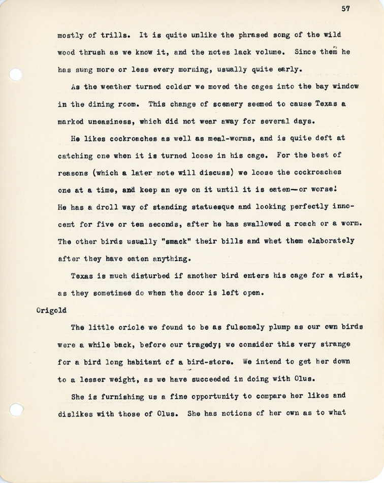 57 mostly of trills. It is quite unlike the phrased song of the wild wood thrush as we know it, and the notes lack volume. Since them he has sung more or less every morning, usually quite early. As the weather turned colder we moved the cages into the bay window in the dining room. This change of scenery seemed to cause Texas a marked uneasiness, which did not wear away for several days. He likes cockroaches as well as meal-worms, and is quite deft at catching one when it is turned loose in his cage. For the best of reasons (which a later note will discuss) we loose the cockroaches one at a time, and keep an eye on it until it is eaten - or worse! He has a droll way of standing statuesque and looking perfectly innocent for five or ten seconds, after he has swallowed the roach or a worm. The other birds usually "smack" their bills and whet them elaborately after they have eaten anything. Texas is much disturbed if another bird enters his cage for a visit, as they sometimes do when the door is left open. Origold The little oriole we found to be as fulsomely plump as our own birds were a while back, before our tragedy; we consider this very strange for a bird long habitant of a bird-store. We intend to get her down to a lesser weight, as we have succeeded in doing with Olus. She is furnishing us a fine opportunity to compare her likes and dislikes with those of Olus. She has notions of her own as to what