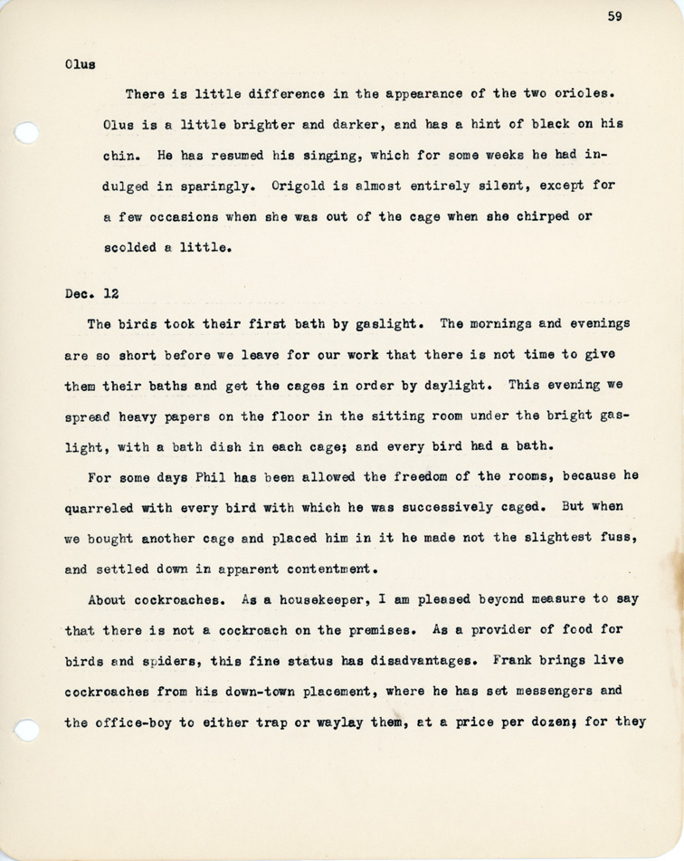 59 Olus There is little difference in the appearance of the tow orioles. Olus is a little brighter and darker, and has a hint of black on his chin. He has resumed his singing, which for some weeks he had indulged in sparingly. Origold is almost entirely silent, except for a few occasions when she was out of the cage when she chirped or scolded a little. Dec. 12 The birds took their first bath by gaslight. The mornings and evenings are so short before we leave for our work that there is not time to give them their baths and get the cages in order by daylight. This evening we spread heavy papers on the floor in the sitting room under the bright gaslight, with a bath dish in each cage; and every bird had a bath. For some days Phil has been allowed the freedom of the rooms, because he quarreled with every bird with which he was successively caged. But when we bought another cage and placed him in it he made not the slightest fuss, and settled down in apparent contentment. About cockroaches. As a housekeeper, I am pleased beyond measure to say that there is not a cockroach on the premises. As a provider of food for birds and spiders, this fine status has disadvantages. Frank brings live cockroaches from his down-town placement, where he has set messengers and the office-boy to either trap or waylay them, at a price per dozen; for they