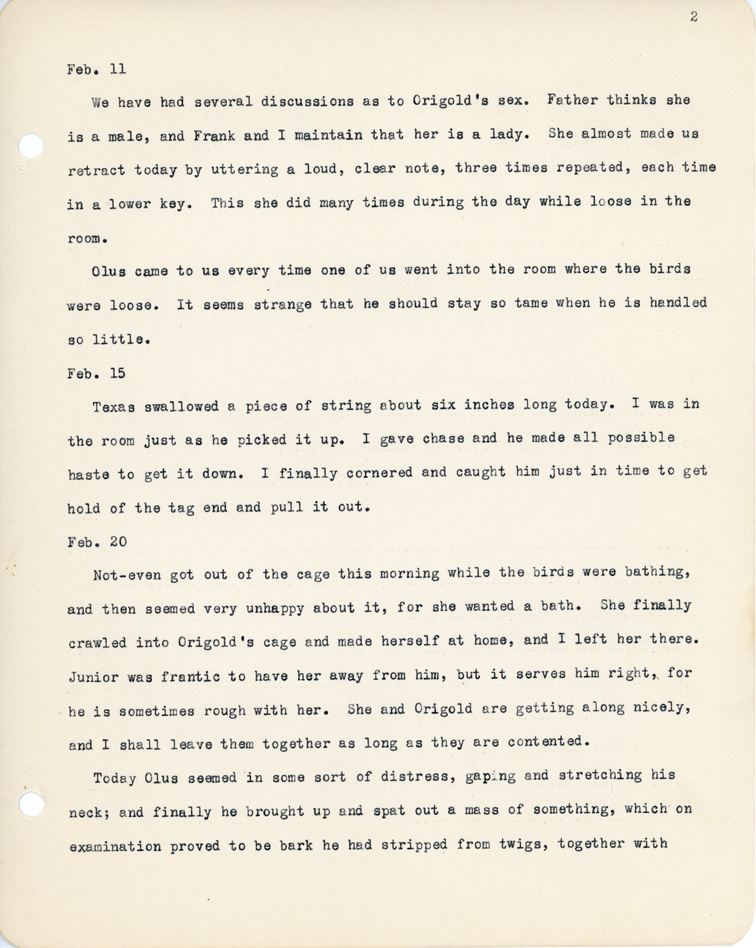 2 Feb. 11 We have had several discussions as to Origold's sex. Father thinks she is male, and Frank and I maintain that her is a lady. She almost made us retract today by uttering a loud, clear note, three times repeated, each time in a lower key. This she did many times during the day while loose in the room. Olus came to us every time one of us went into the room where the birds were loose. It seems strange that he should stay so tame when he is handled so little. Feb. 15 Texas swallowed a piece of string about six inches long today. I was in the room just as he picked it up. I gave chase and he made all possible haste to get it down. I finally cornered and caught him just in time to get hold of the tag end and pull it out. Feb. 20 Not-even got out of the cage this morning while the birds were bathing, and then seemed very unhappy about it, for she wanted a bath. She finally crawled into Origold's cage and made herself at home, and I left her there. Junior was frantic to have her away from him, but it serves him right, for he is sometimes rough with her. She and Origold are getting along nicely, and I shall leave them together as long as they are contented. Today Olus seemed in some sort of distress, gaping and stretching his neck; and finally he brought up and spat out a mass of something, which on examination proved to be bark he had stripped from twigs, together with