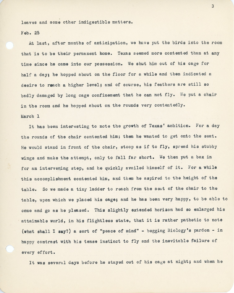 3 leaves and some other indigestible matters. Feb. 25 At last, after months of anticipation, we have put the birds into the that is to be their permanent home. Texas seemed more contented than at any time since he came into our possession. We shut him out of his cage for half a day; he hopped about on the floor for a while and then indicated a desire to reach a higher level; and of course, his feathers are still so badly damaged by long cage confinement that he can not fly. We put a chair in the room and he hopped about on the rounds very contentedly. March 1 It has been interesting to note the growth of Texas' ambition. For a day the rounds of the chair contented him; then he wanted to get onto the seat. He would stand in front of the chair, stoop as if to fly spread his stubby wings and make the attempt, only to fall far short. We then put a box in for an intervening step, and he quickly availed himself of it. For a while this accomplishment contented him, and them he aspired to the height of the table. So we made a tiny ladder to reach from the seat of the chair to the table, upon which we placed his cage; and he has been very happy, to be able come and go as he pleased. This slightly extended horizon had so enlarged his attainable world, in his flightless state, that it is rather pathetic to note (what shall I say?) a sort of "peace of mind"- begging Biology's pardon- in happy contrast with his tense instinct to fly and the inevitable failure of every effort. It was several days before he stayed out of his cage at night; and when he