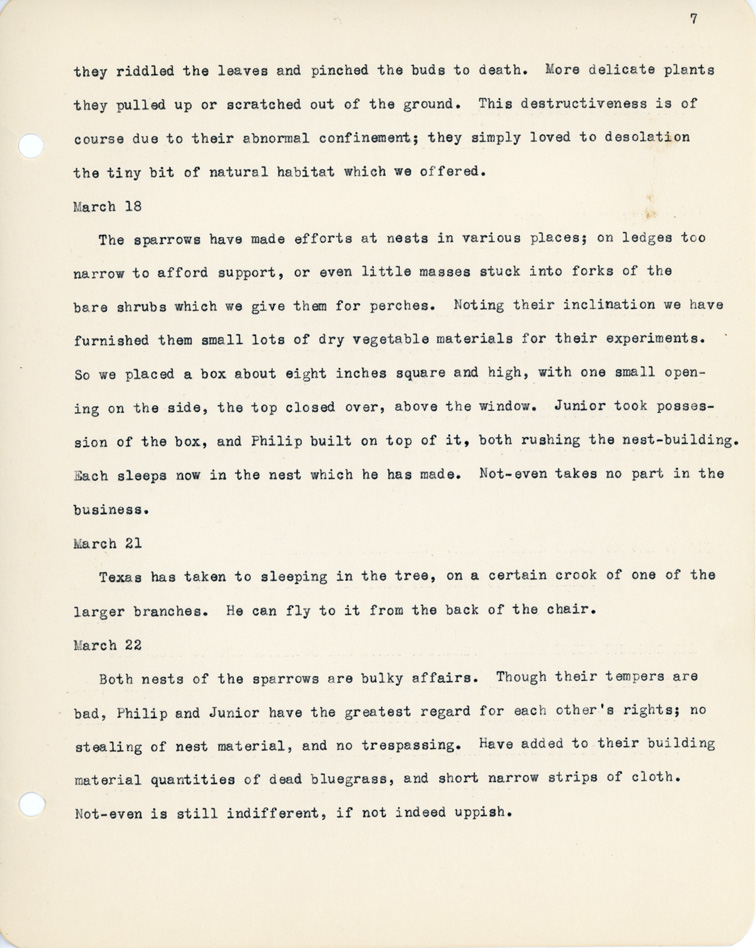 7 they riddled the leaves and pinched the buds to death. More delicate plants they pulled up or scratched out of the ground. This destructiveness is of course due to their abnormal confinement; they simply loved to desolation the tiny bit of natural habitat which we offered. March 18 The sparrows have made efforts at nests in various places; on ledges too narrow to afford support, or even little masses stuck into forks of the bare shrubs which we give them for perches. Noting their inclination we have furnished them small lots of dry vegetable materials for their experiments. So we placed a box about eight inches square and high, with one small opening on the side, the top closed over, above the window. Junior took possession of the box, and Philip built on top of it, both rushing the nest-building. Each sleeps now in the nest which he has made. Not-even takes no part in the business. March 21 Texas has taken to sleeping in the tree, on a certain crook of one of the larger branches. He can fly to it from the back of the chair. March 22 Both nests of the sparrows are bulky affairs. Though their tempers are bad, Philip and Junior have the greatest regard for each other's rights; no stealing of nest material, and no trespassing. Have added to their building material quantities of dead bluegrass, and short narrow strips of cloth. Not-even is still indifferent, if not indeed uppish.