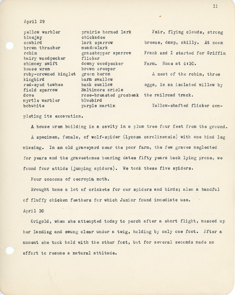 11 April 29 yellow warbler prairie horned lark bluejay chickadee cowbird lark sparrow brown thrasher meadowlark robin grasshopper sparrow hairy woodpecker flicker chimney swift downy woodpecker House wren brown creeper ruby-crowned kinglet green heron kingbird barn swallow red-eyed towhee bank swallow field sparrow Baltimore oriole dove rose-breasted grosbeak myrtle warbler bluebird bobwhite purple martin Fair, flying clouds, strong breeze, damp, chilly. At noon Frank and I started for Griffin Farm. Home at 6:30. A nest of the robin, three eggs, in an isolated willow by the railroad track. Yellow-shafted flicker completing its excavation. A house wren building in a cavity in a plum tree four feet from the ground. A specimen, female, of wolf-spider (Lycosa carolinensis) with one hind leg missing. In an old graveyard near the poor farms, the few graves neglected for years and the gravestones bearing dates fifty years back lying prone, we found four attids (jumping spiders). We took these five spiders. Four cocoons of cecropia moth. Brought home a lot of crickets for our spiders and birds; also a handful of fluffy chicken feathers for which Junior found immediate use. April 30 Origold, when she attempted today to perch after a short flight, messed up her landing and swung clear under a twig, holding by only one foot. After a moment she took hold with the other foot, but for several seconds made no effort to resume a natural attitude.