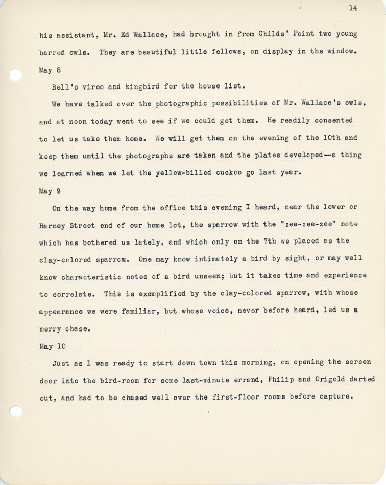 14 his assistant, Mr. Ed Wallace, had brought in from Childs' Point two young barred owls. They are beautiful little fellows, on display in the window. May 8 Bell's vireo and kingbird for the house list. We have talked over the photographic possibilities of Mr. Wallace's owls, and at noon today went to see if we could get them. He readily consented to let us take them home. We will get them on the evening of the 10th and keep them until the photographs are taken and the plates developed-a thing we learned when we let the yellow-billed cuckoo go last year. May 9 On the way home from the office this evening I heard, near the lower or Harney Street end of our home lot, the sparrow with the "zee-zee-zee" note which has bothered us lately, and which only on the 7th we placed as the clay-colored sparrow. One may know intimately a bird by sight, or may well know characteristic notes of a bird unseen; but it takes time and experience to correlate. This is exemplified by the clay-colored sparrow, with whose appearance we were familiar, but whose voice, never before heard, led us a merry chase. May 10 Just as I was ready to start down town this morning, on opening the screen door into the bird-room for some last-minute errand, Philip and Origold darted out, and had to be chased well over the first-floor rooms before capture.
